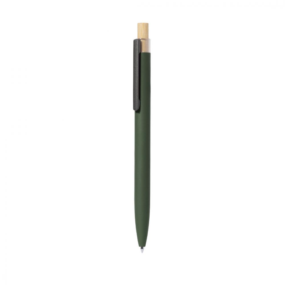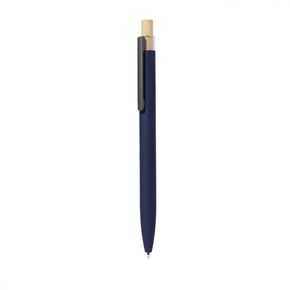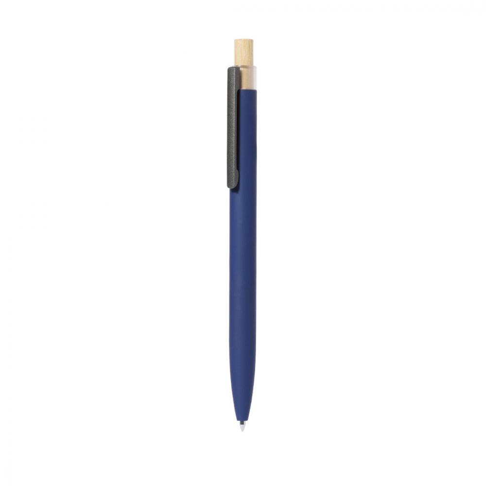 Шариковая ручка с нажимным механизмом, изготовленная из переработанного алюминия. Кнопка выполнена из бамбука. Металлический клип. Синие чернила.