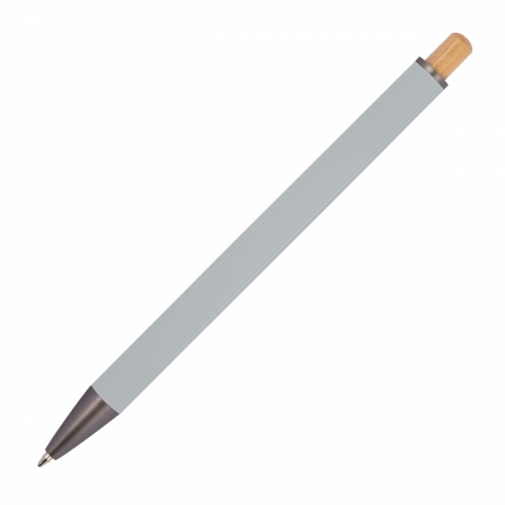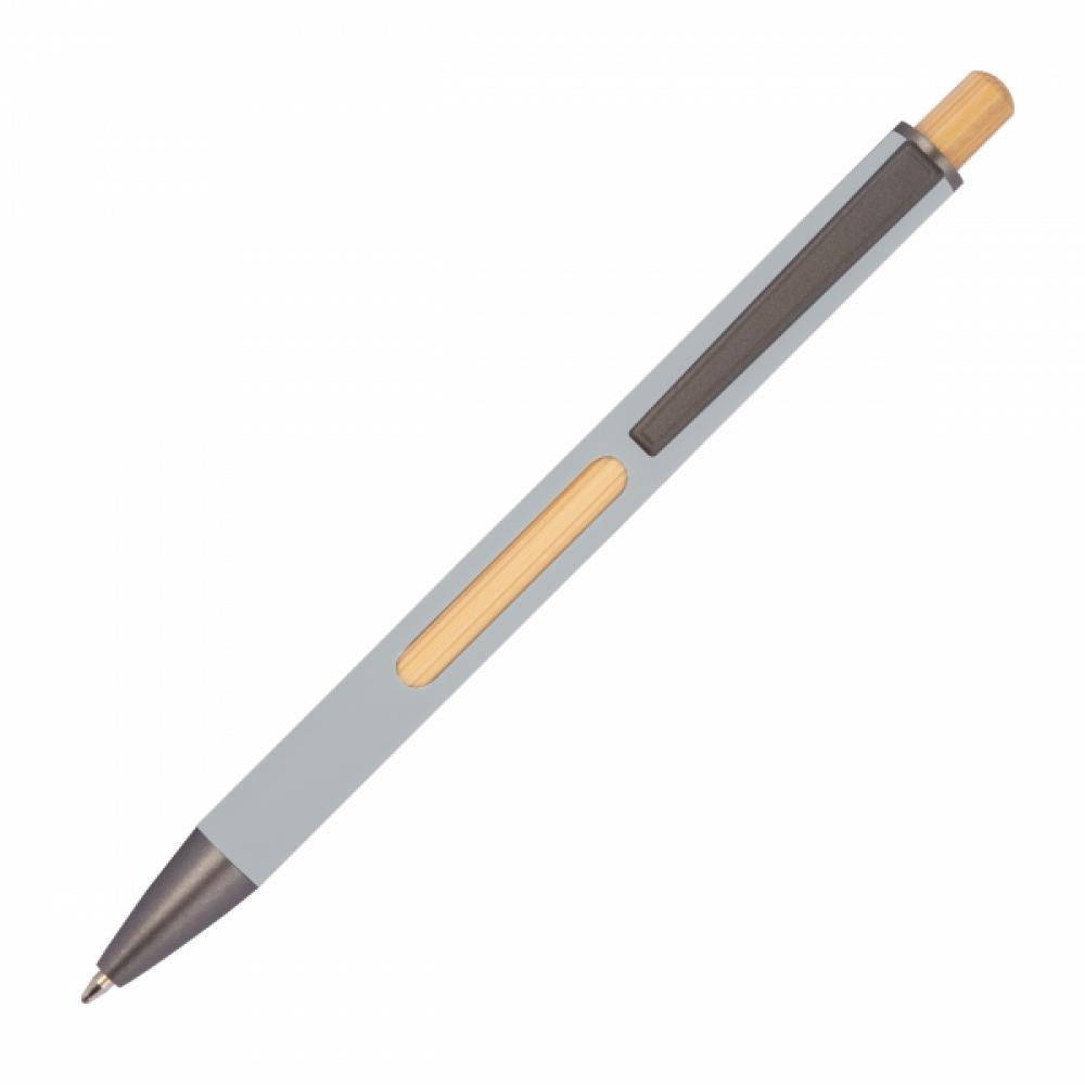 Ручка-шарик из переработанного алюминия с черной металлической клипсой, синим стержнем, бамбуковой кнопкой и бамбуковым окошком на уровне клипсы.