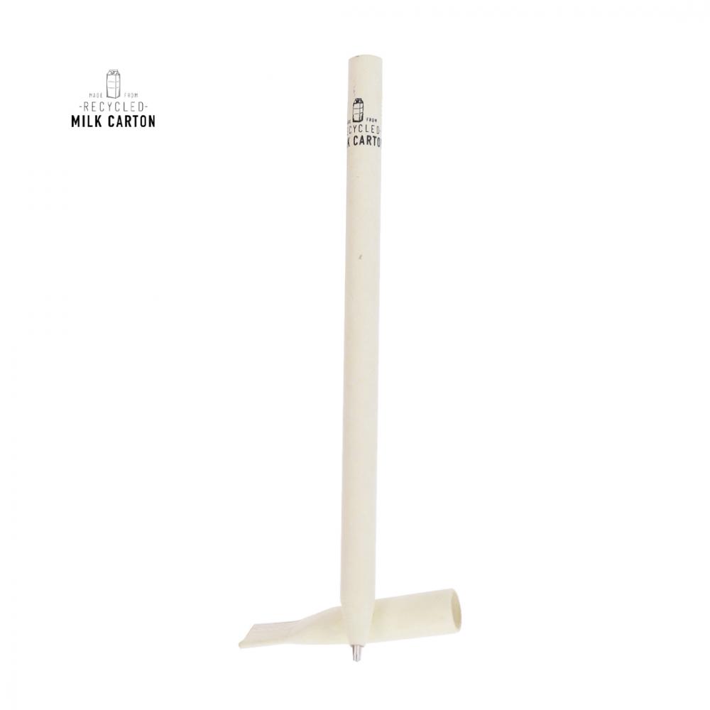 Ручка с корпусом из переработанных молочных пакетов и белыми деталями. С крышкой и синим чернилом, с этикеткой из переработанного молочного пакета на корпусе. Молочные пакеты в основном изготовлены из картона и алюминия. Во время их переработки различные материалы разделяются для повторного использования, способствуя бесконечному пути круговой экономики. Этот материал характеризуется высокой перерабатываемостью, а также легкостью и прочностью