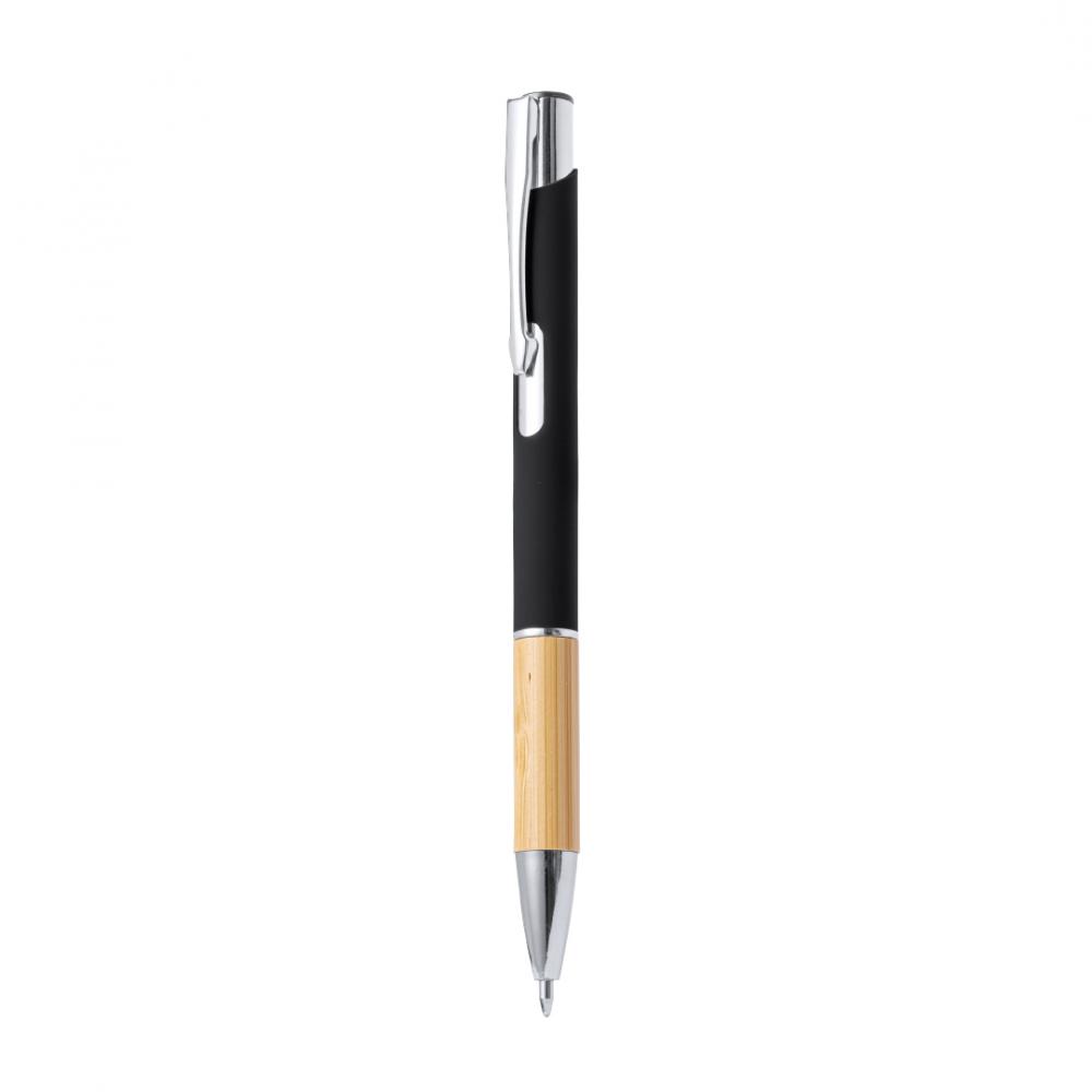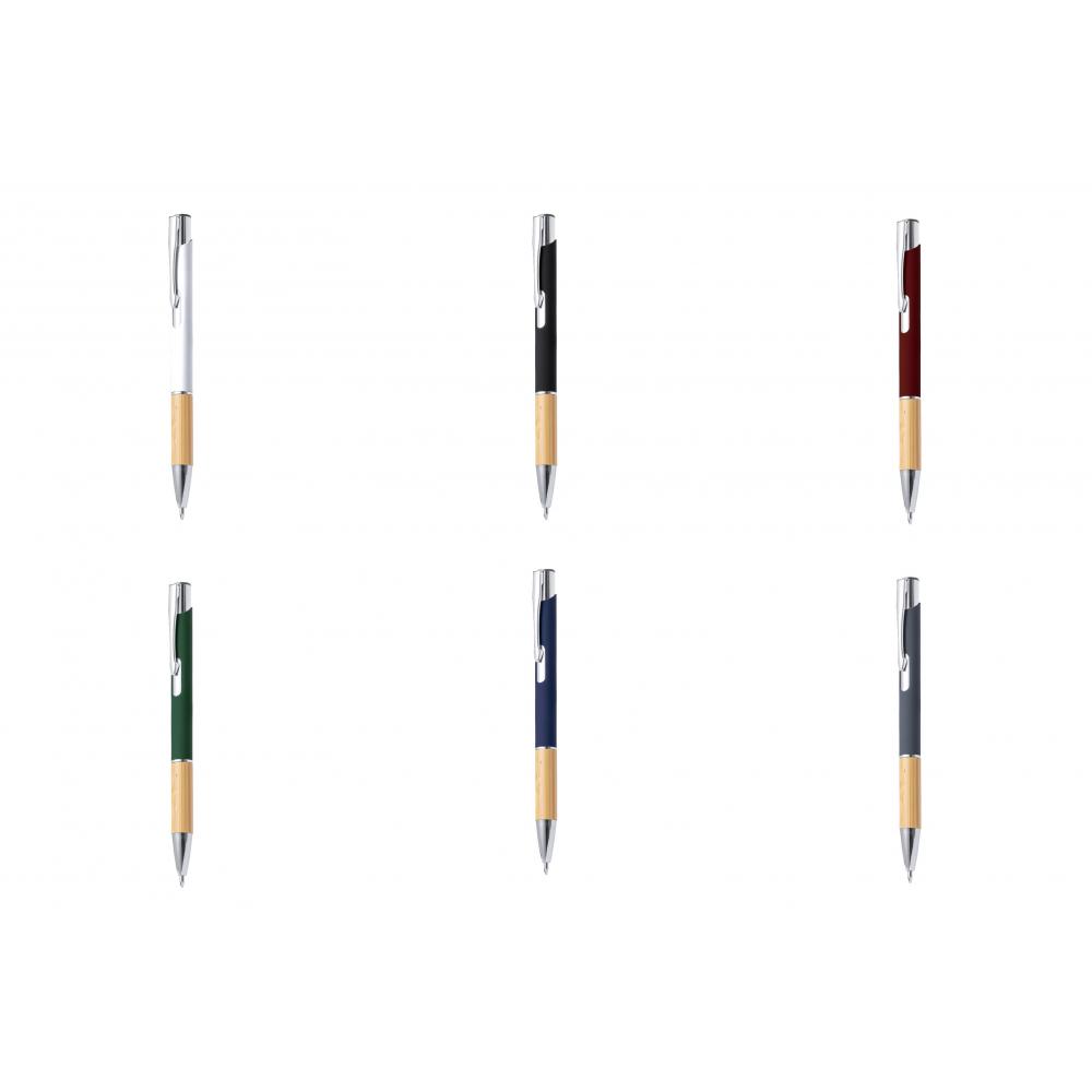 Элегантная шариковая ручка с нажимным механизмом. Прочный алюминиевый корпус с резиновым покрытием и вставкой из бамбука. Металлический клип. Синие чернила.