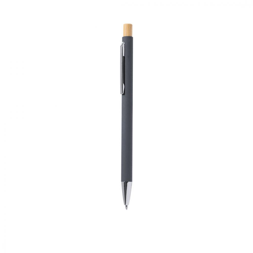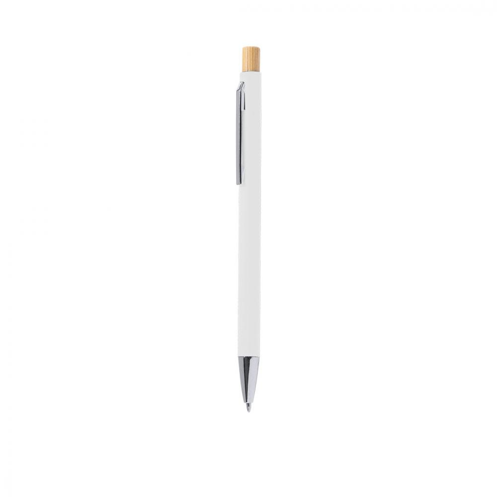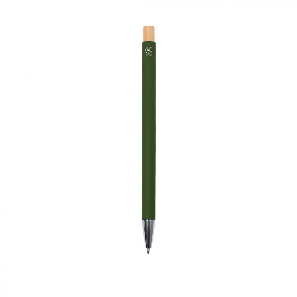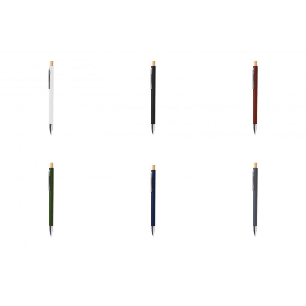 Нажимная ручка из переработанного алюминия. Кнопка и корпус из бамбука с матовой резиновой отделкой. Металлический зажим и этикетка из переработанного алюминия на верхушке ручки, с синим чернилом. Переработанный алюминий - материал с почти бесконечными возможностями переработки, не теряющий своих исходных свойств и потребляющий меньше энергии в этом процессе. Сертификация GRS (Глобальный стандарт переработки), гарантирующая переработанный происхождение материала, используемого для производства продукта. Материалы, такие как бамбук, способствуют использованию натуральных сырьевых материалов, снижая загрязняющие выбросы. Кроме того, бамбук происходит от очень устойчивого и универсального растения, с быстрым ростом и регенерацией, что делает его отличной альтернативой традиционному использованию дерева. Крупный стержень. Бамбук/Переработанный алюминий. Резиновая отделка.
