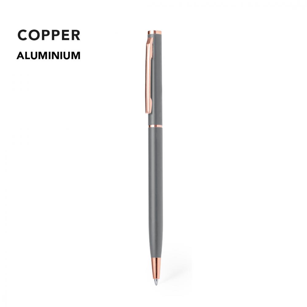 Характеристики Отличная алюминиевая шариковая ручка с механизмом поворота. Прочный матовый алюминиевый корпус с декоративными элементами в элегантной медной отделке, доступен в широкой цветовой гамме. Металлический зажим и синие чернила. Поставляется в индивидуальном переработанном пакете. Алюминий.