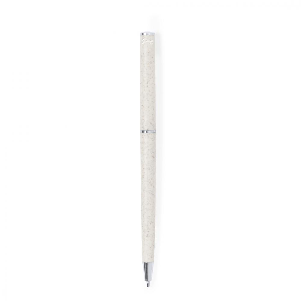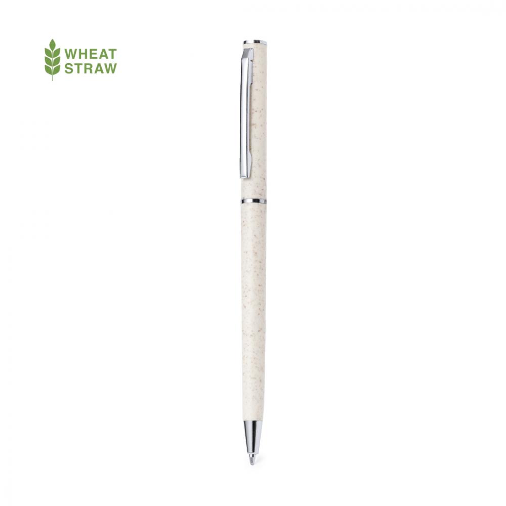 Характеристики Шариковая ручка с корпусом из пшеничной соломы. С металлическим зажимом и хромированными фурнитурными деталями, механизм поворота и синим чернилом. С логотипом из пшеничной соломы, доступна в натуральном цвете. Пшеничная солома способствует использованию натуральных сырьевых материалов, тем самым снижая выбросы загрязняющих веществ. Пшеничная солома/ABS