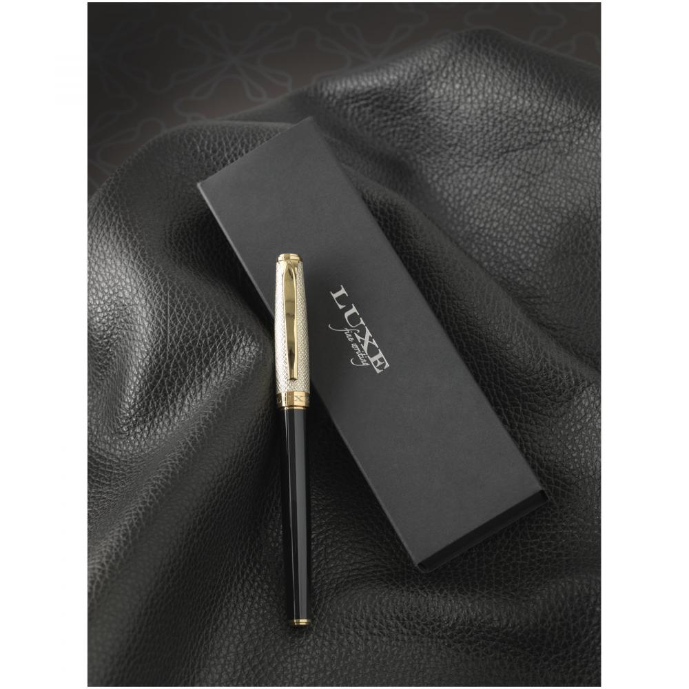 Роскошная роллерная ручка с золотой кожаной крышкой и лакированными золотыми элементами, поставляется в подарочной коробке Luxe. Нижняя часть корпуса изготовлена из латуни с лаком, верхняя часть — из латуни и полиуретана. Размеры ручки: 14 см x 1,15 см, вес: 32 г, длина письма: 500 м.