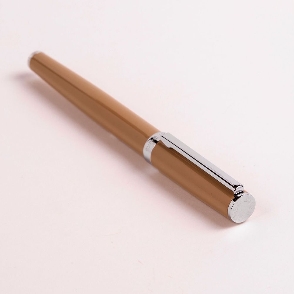 Наш культовый силуэт Gear возвращается с вечной изюминкой, с упрощённым логотипом в виде кольца и глянцевым лаком. Эта новая версия Gear уже ощущается как икона и, вероятно, является нашим самым коммерчески успешным изделием. Она отличается роскошным глянцевым лаком на фирменной оправе. Это изысканный взгляд на минималистичный дизайн, который мгновенно становится классическим письменным инструментом. Доступен в различных цветах, как в нейтральных, например, в этом верблюжьем оттенке, так и в ярких цветовых блоках.