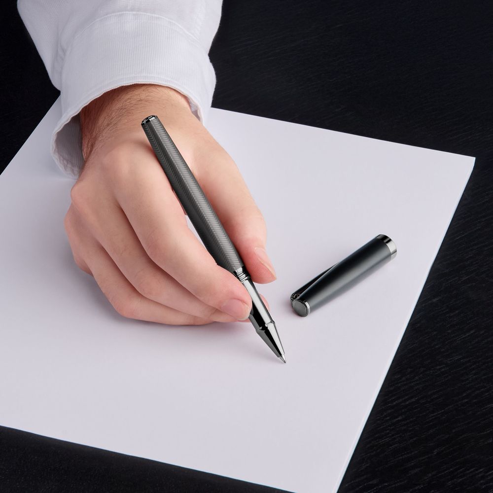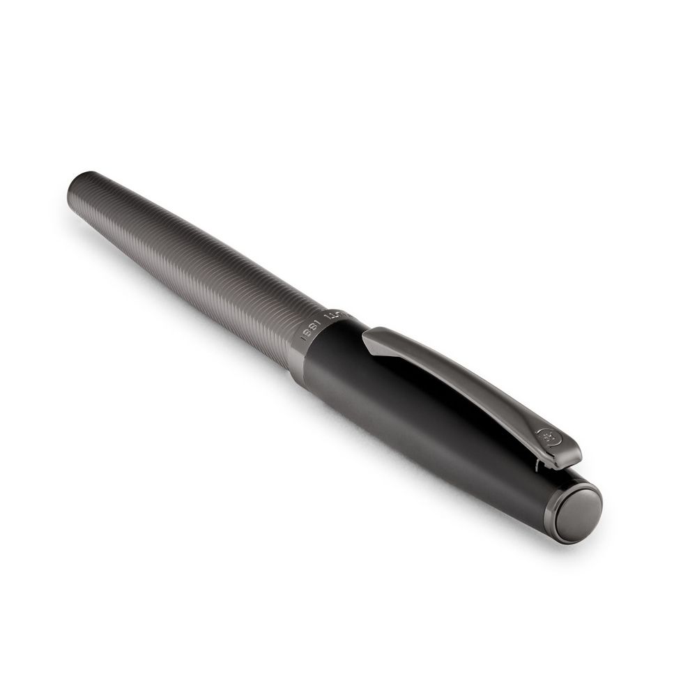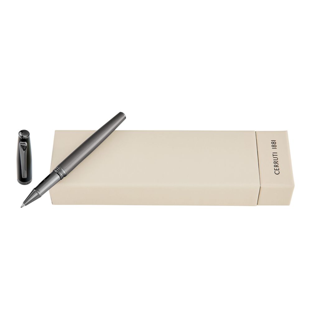Выдающийся элемент серии Cerruti 1881 Islington, эта роллерная ручка сочетает матовый черный колпачок с матовым стволом цвета "пистолетный металл", украшенным изысканным узором "елочка". Тонкий контраст, в сочетании с системой завинчивающегося колпачка и логотипом CRR на клипе, подчеркивает её роскошный и современный стиль.