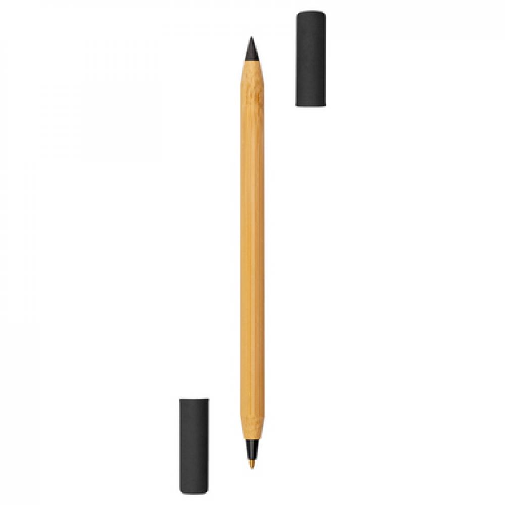 Шариковая ручка 2 в 1 с медленно стирающимся карандашом "infinity", длина письма около 1500 метров благодаря специальному медленно стирающемуся наконечнику, затачивается, бамбуковый корпус, 2 цветных бумажных колпачка.