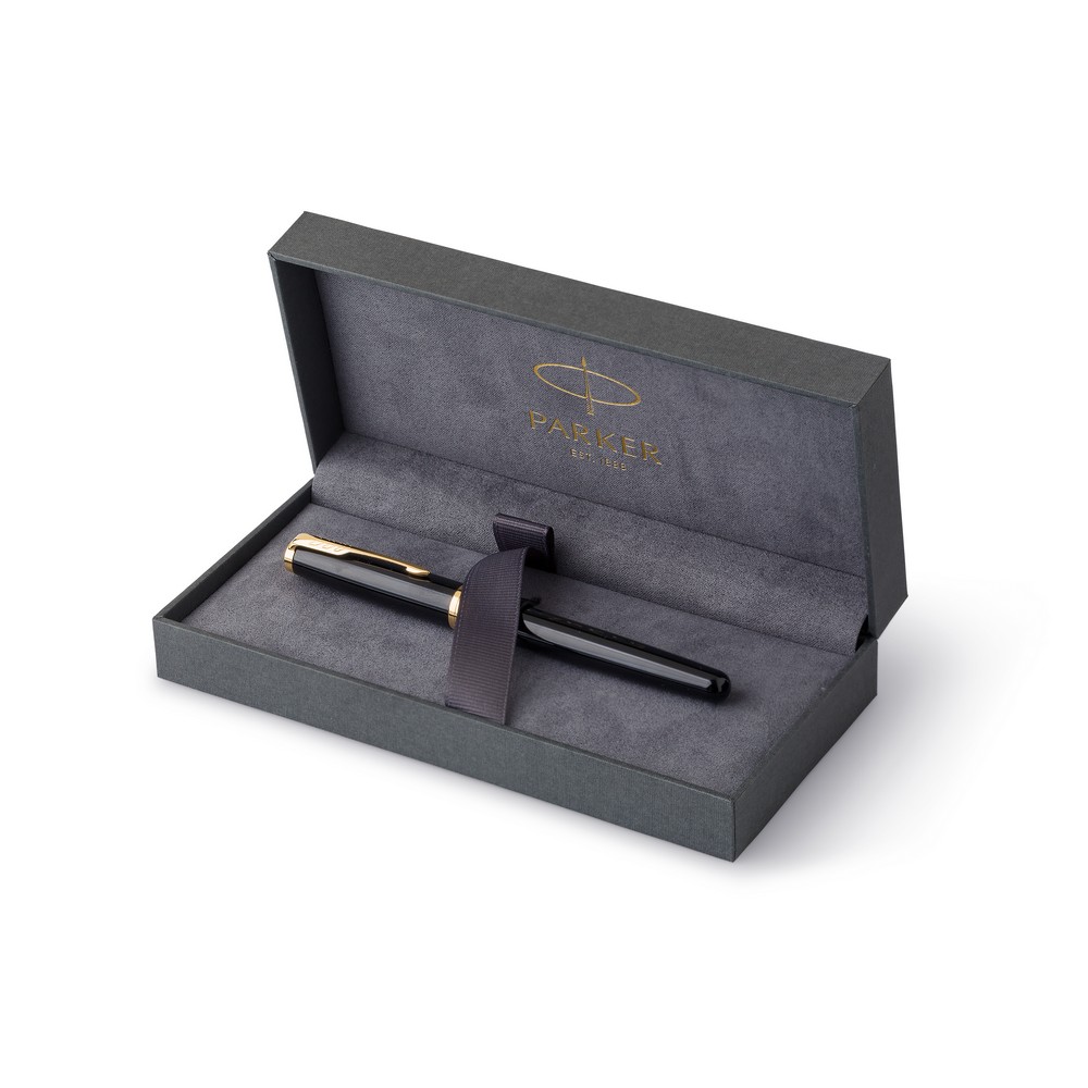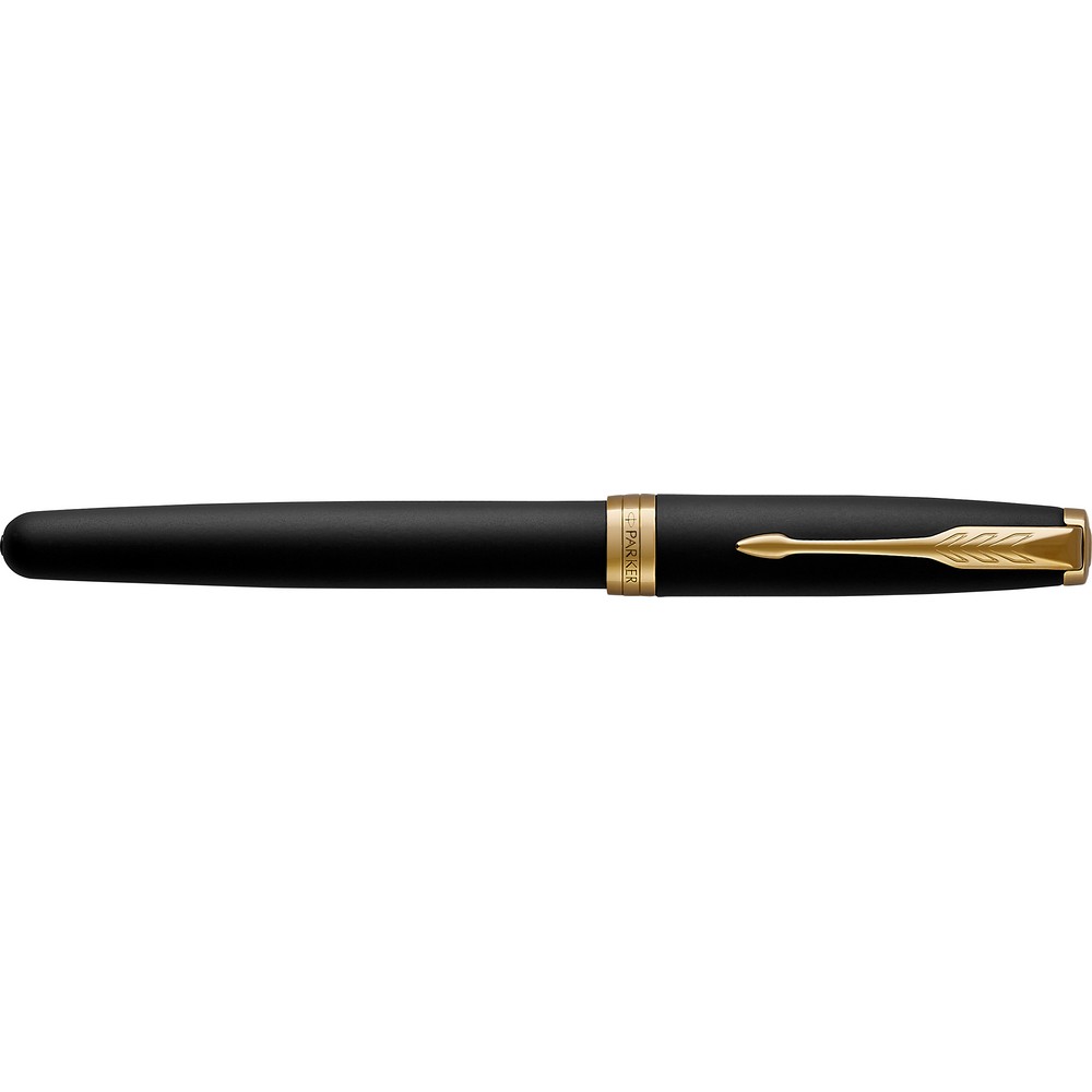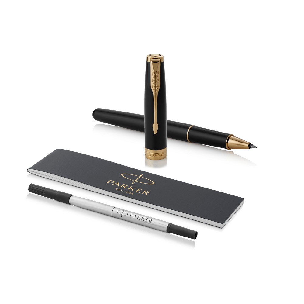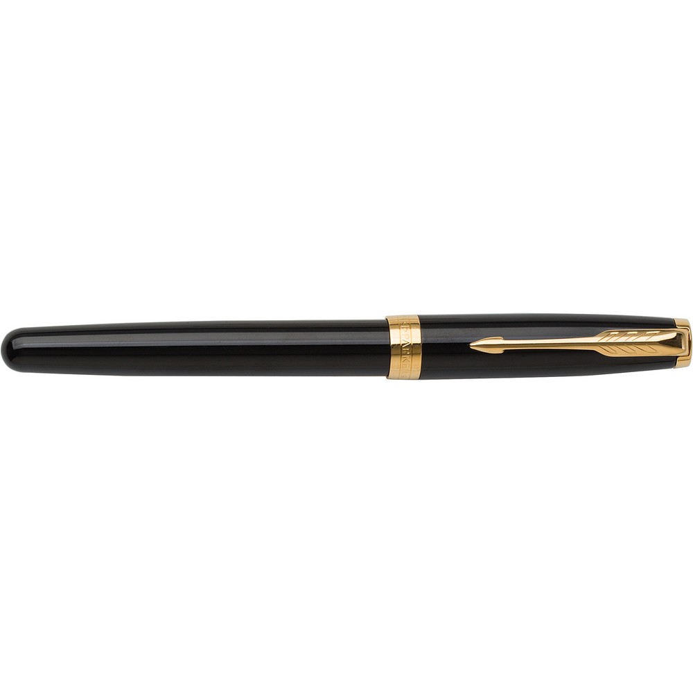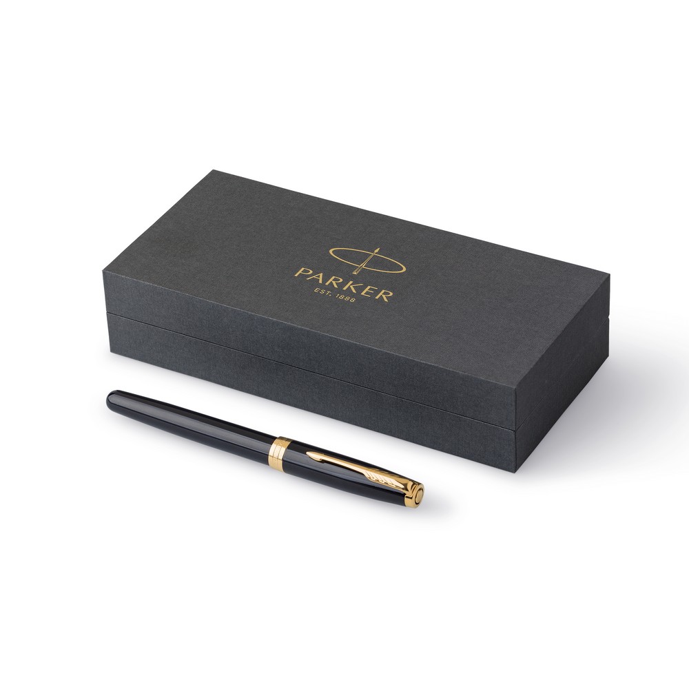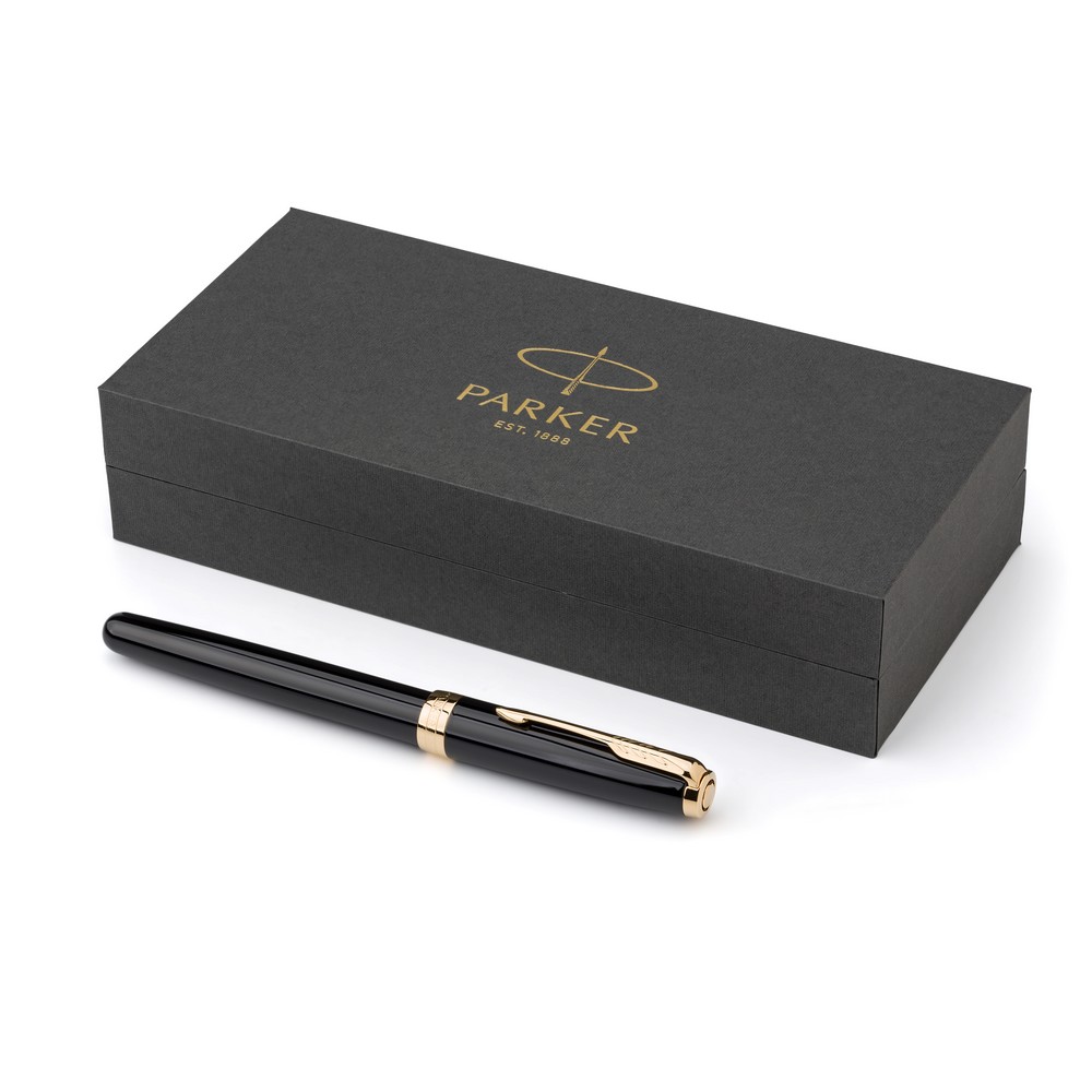 Ручка-роллер Parker Sonnet пишет черными чернилами, упакована в подарочную коробку, изготовлена из металла.