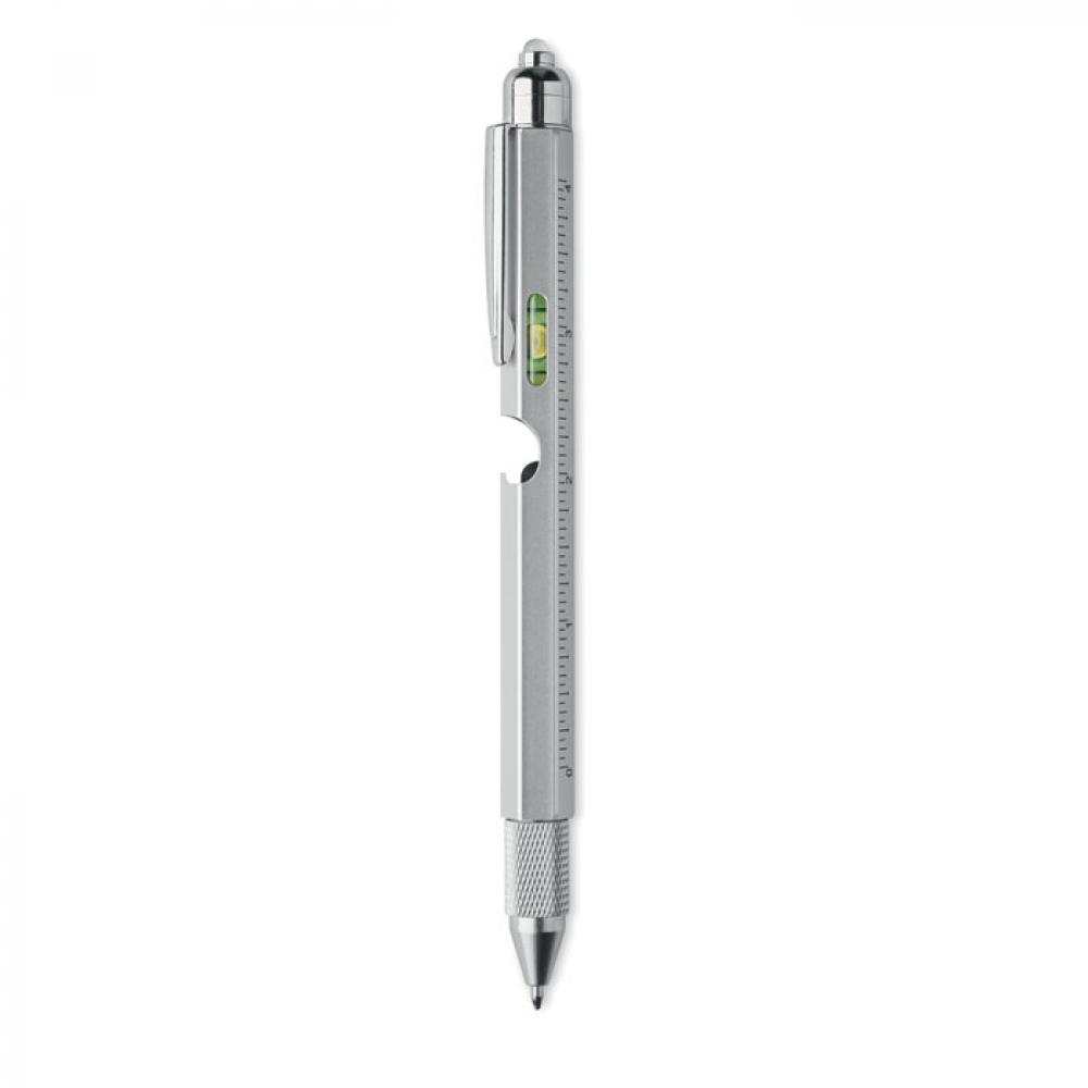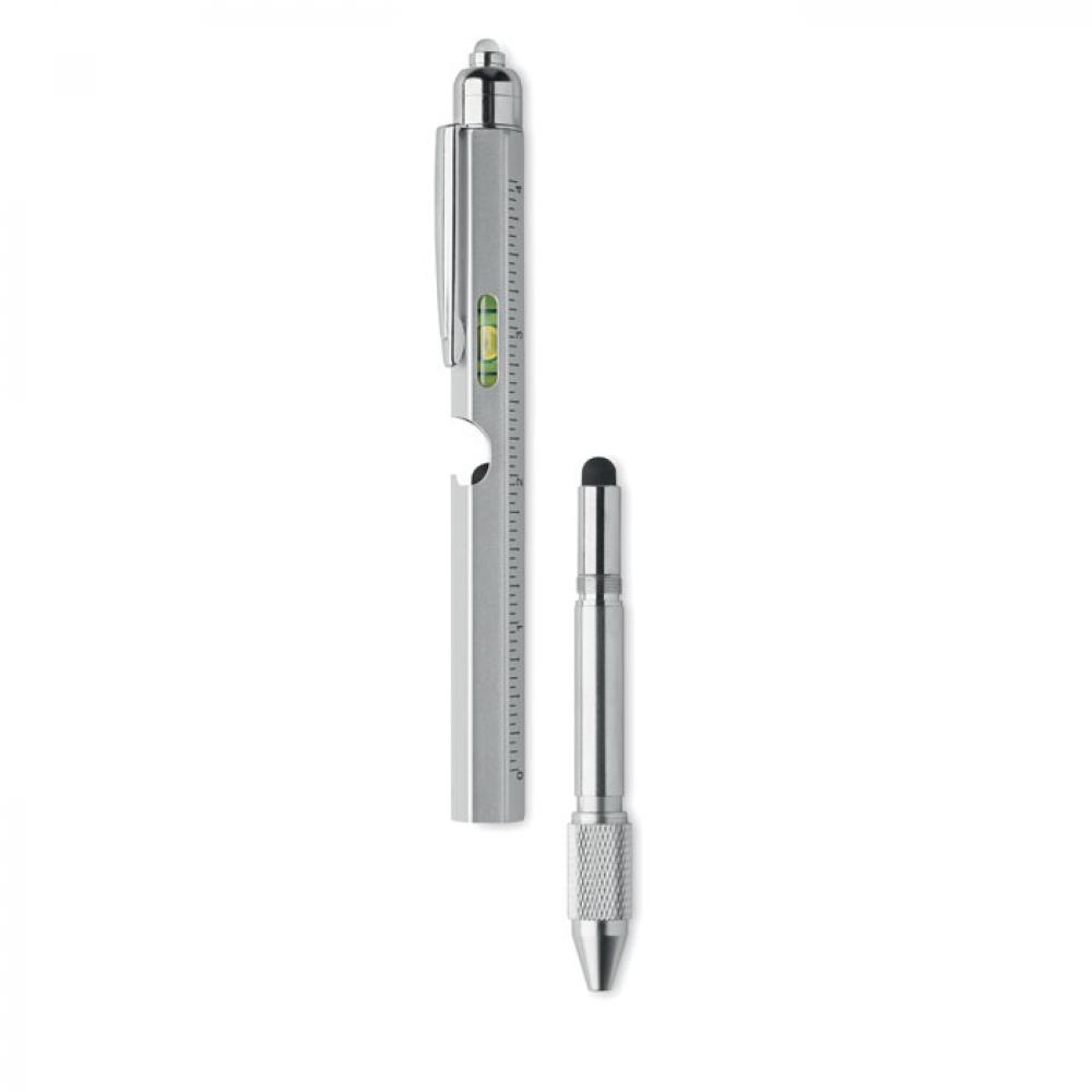 Поворотная шариковая ручка из нержавеющей стали с уровнем и линейкой. Есть также стилус, насадки для отверток с крестообразной и плоской головкой, фонарик. 3 батарейки AG в комплекте. Синие чернила.