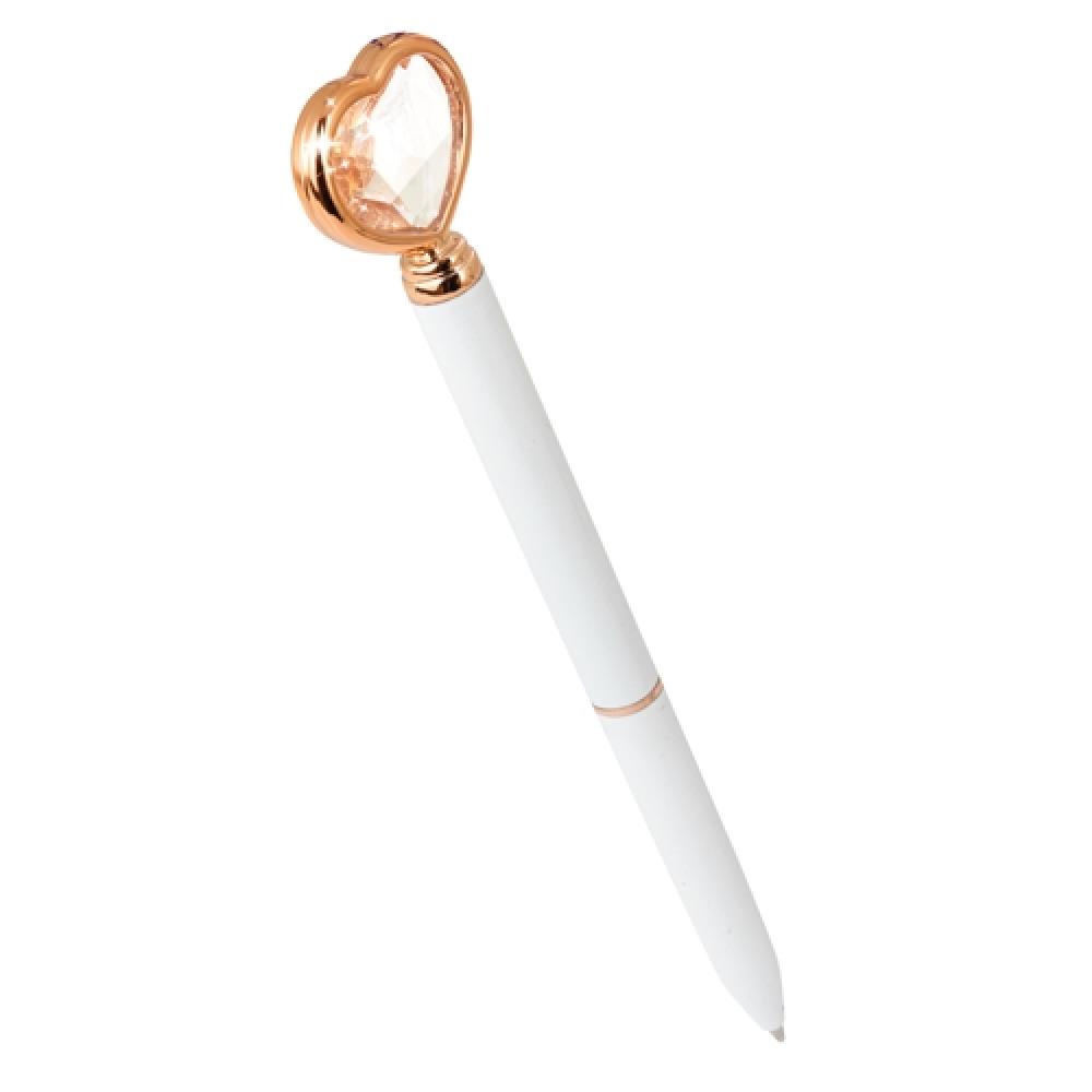 Шариковая ручка с деталями в виде алмазного сердца и золотыми отделками. Синий стержень.