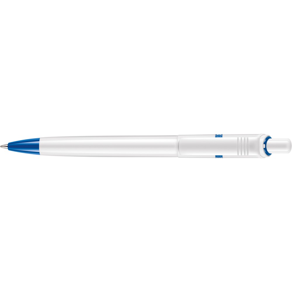 Шариковая ручка Ducal с белым корпусом, цветными акцентами, пишет синим цветом, оснащена немецким документальным чернилами, изготовлена из пластика ABS, никеля и металла.