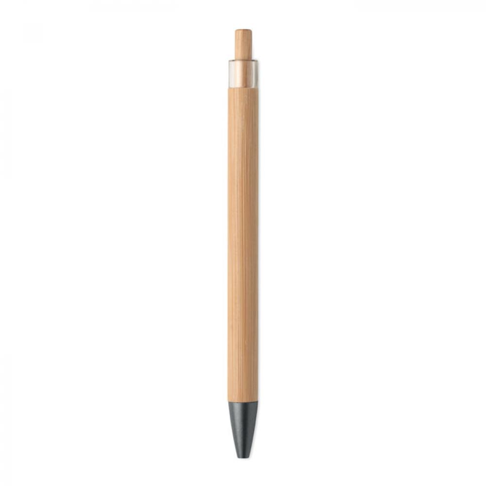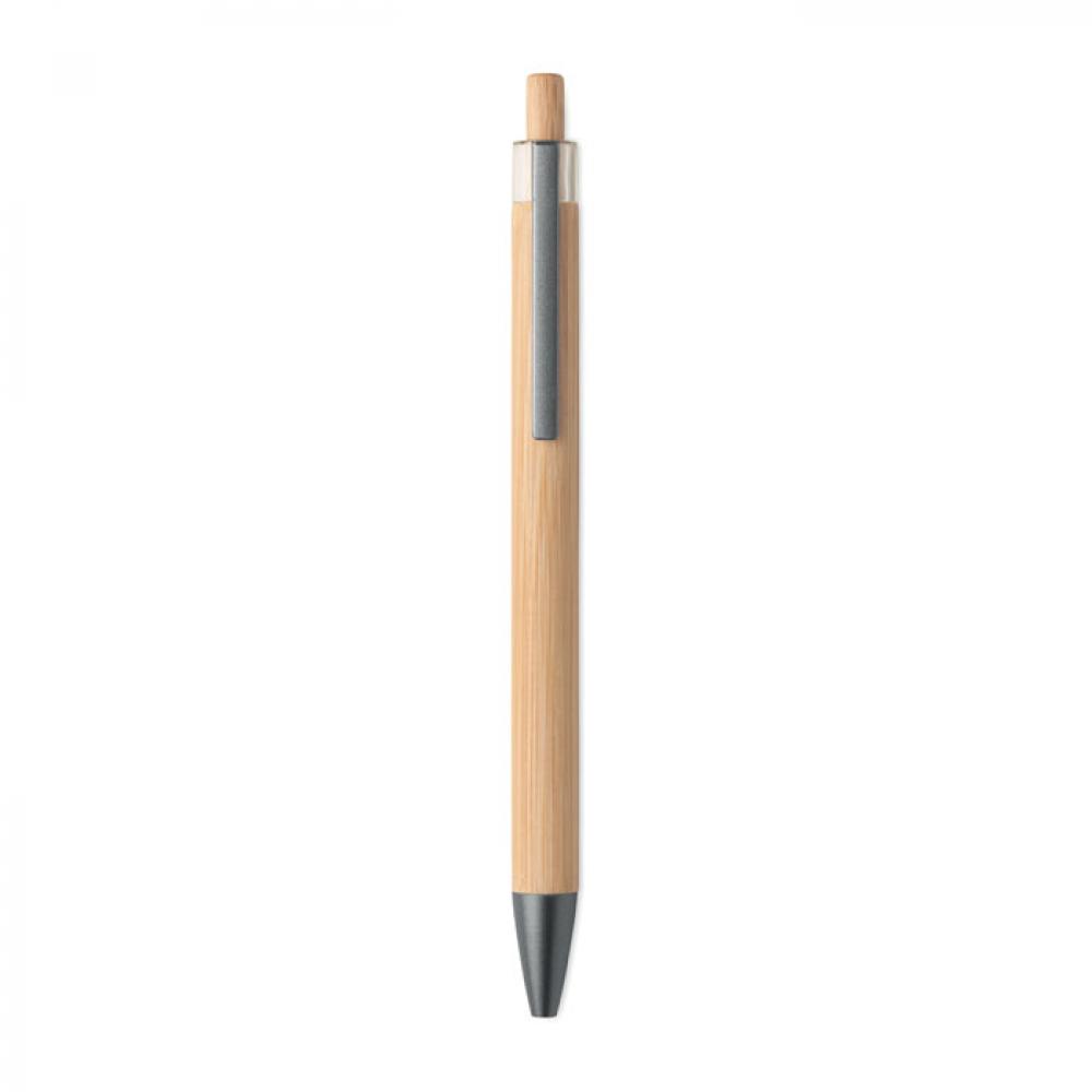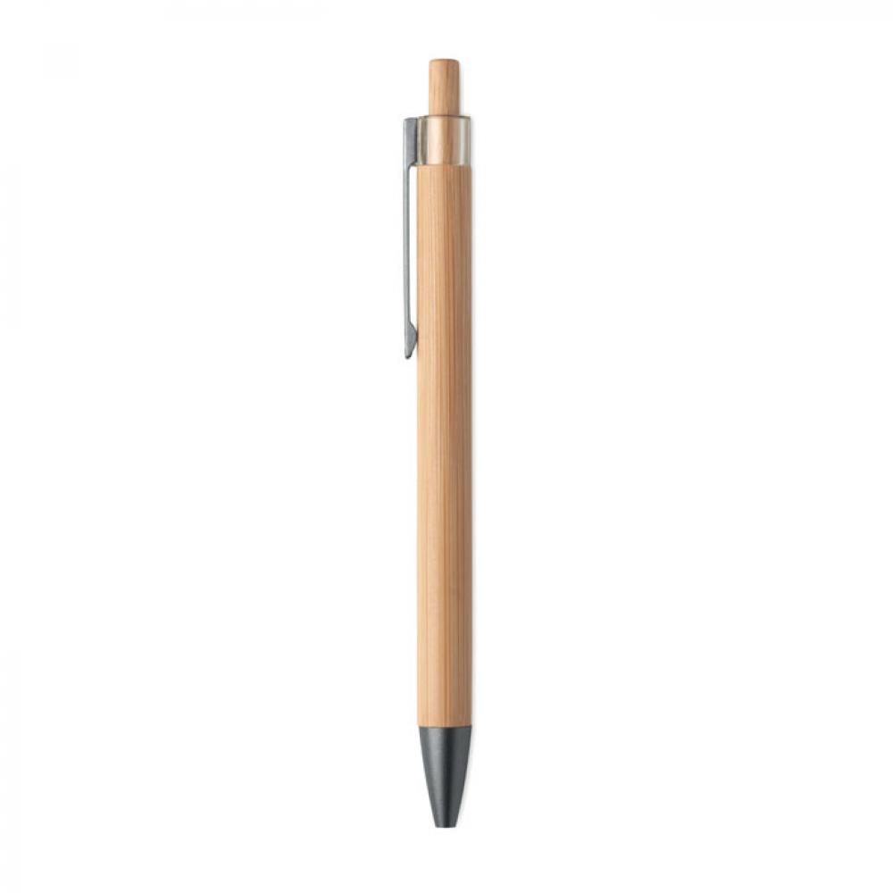 Кнопочная шариковая ручка из бамбука с металлическим зажимом. Синие чернила.