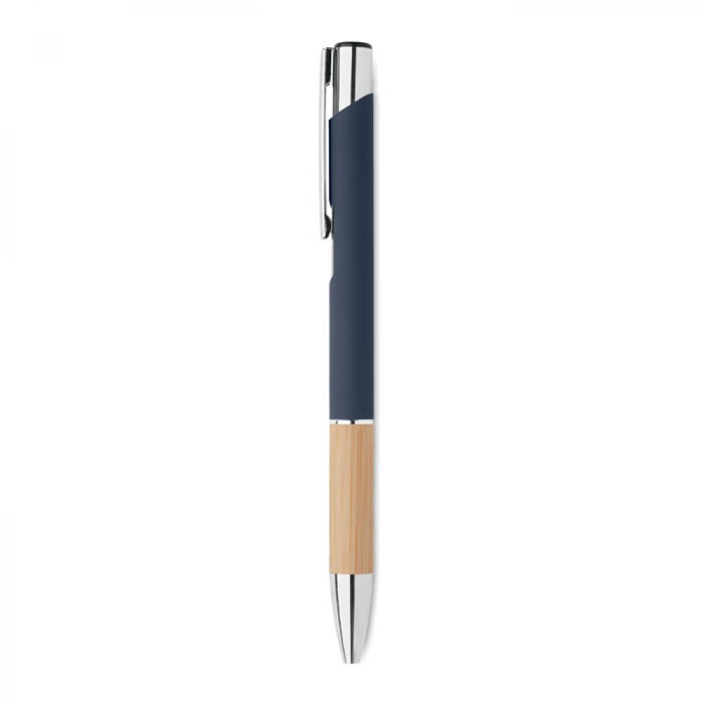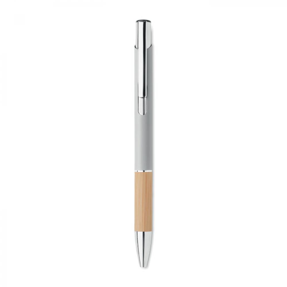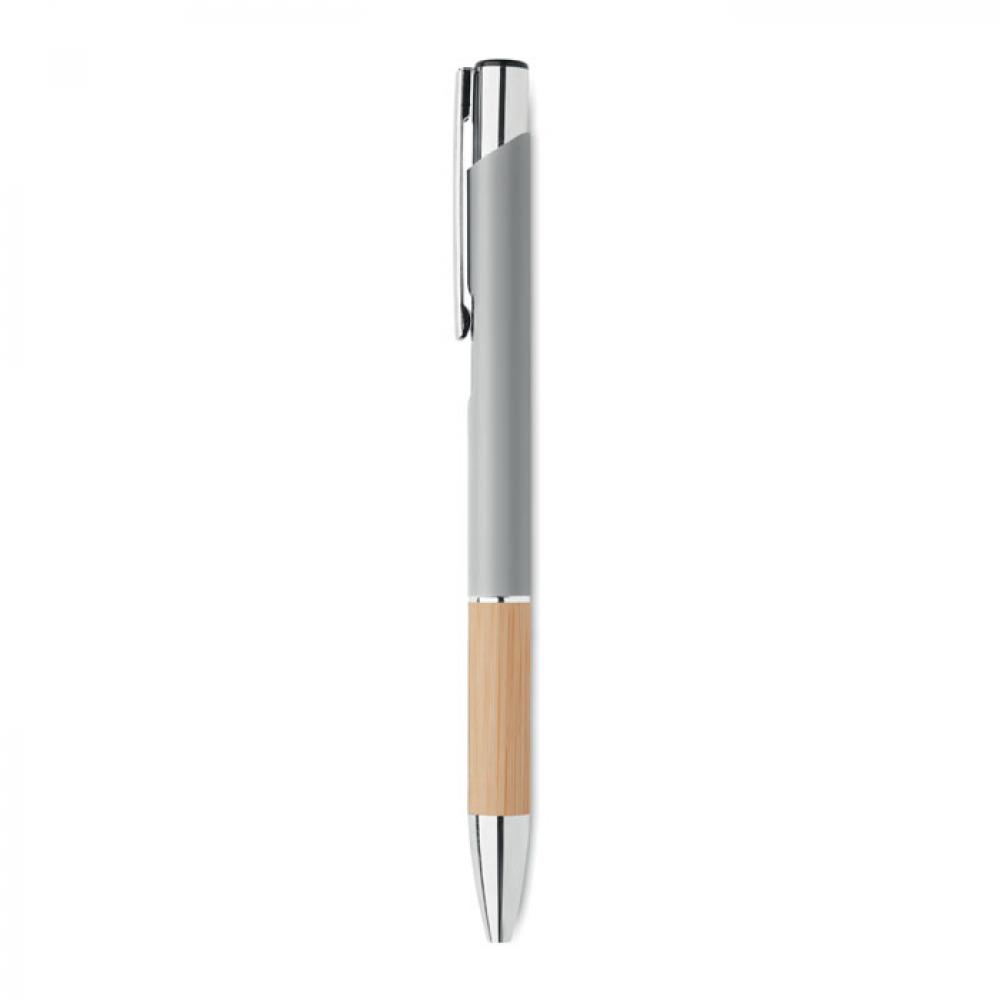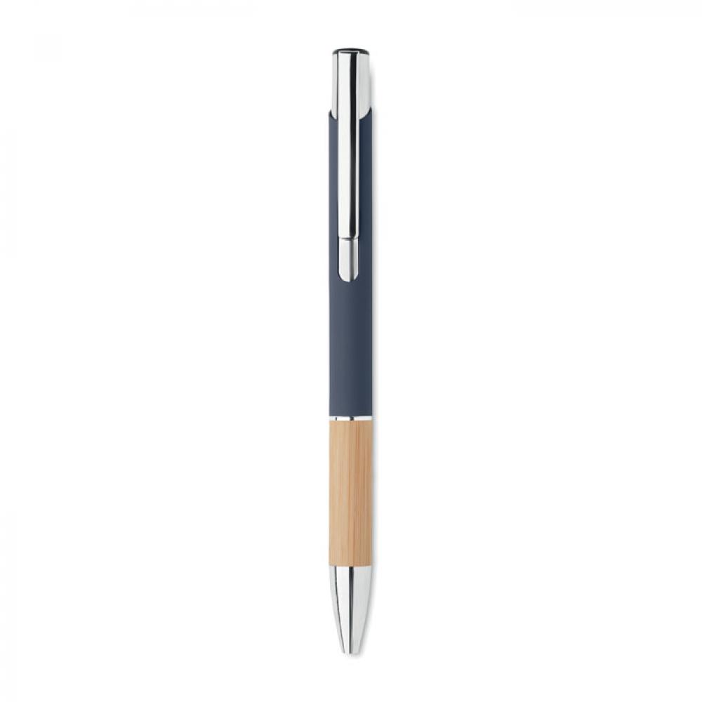 Кнопочная ручка из алюминия и бамбука. Синие чернила.