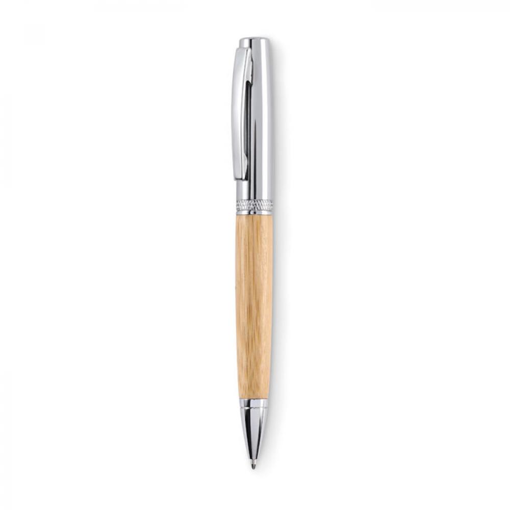 Металлическая шариковая ручка в бамбуковом корпусе в тубусе из бамбука с алюминиевой крышкой. Синие чернила.
