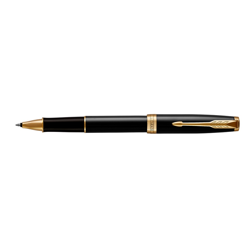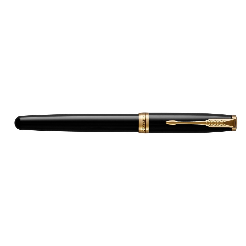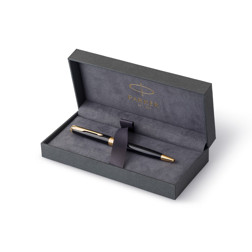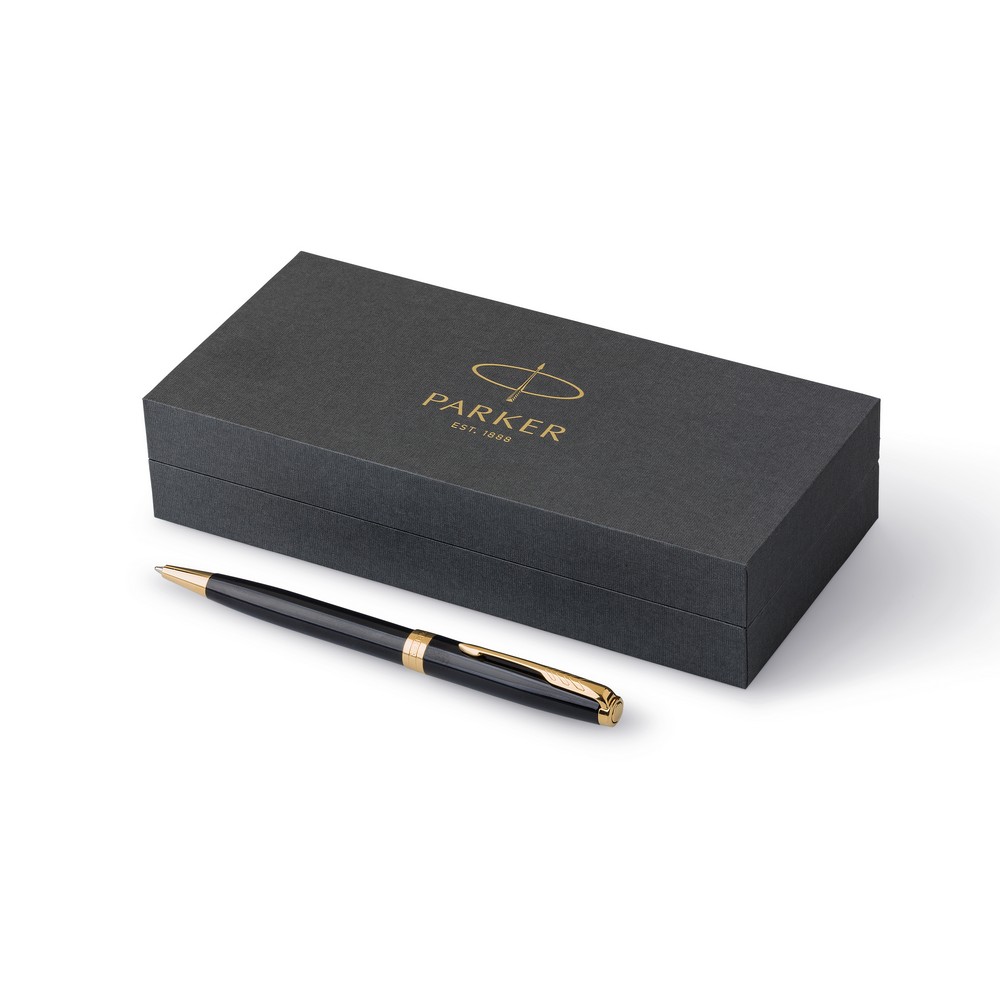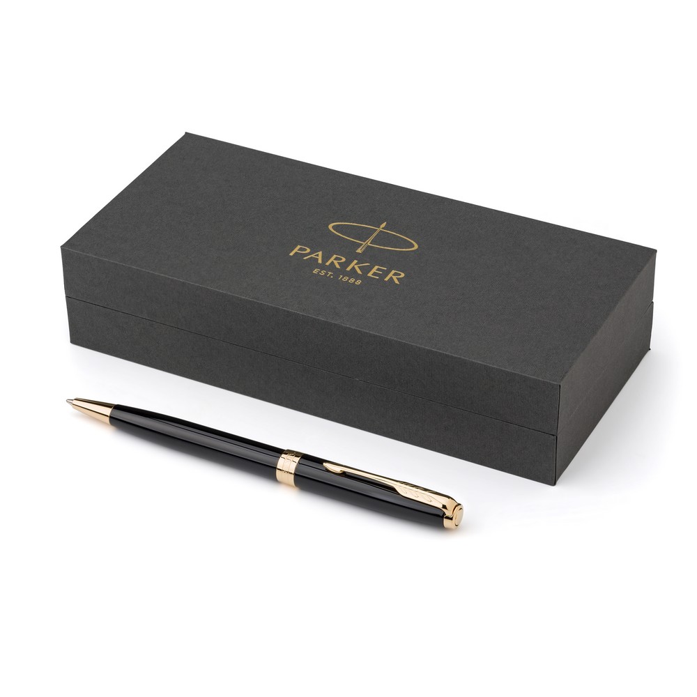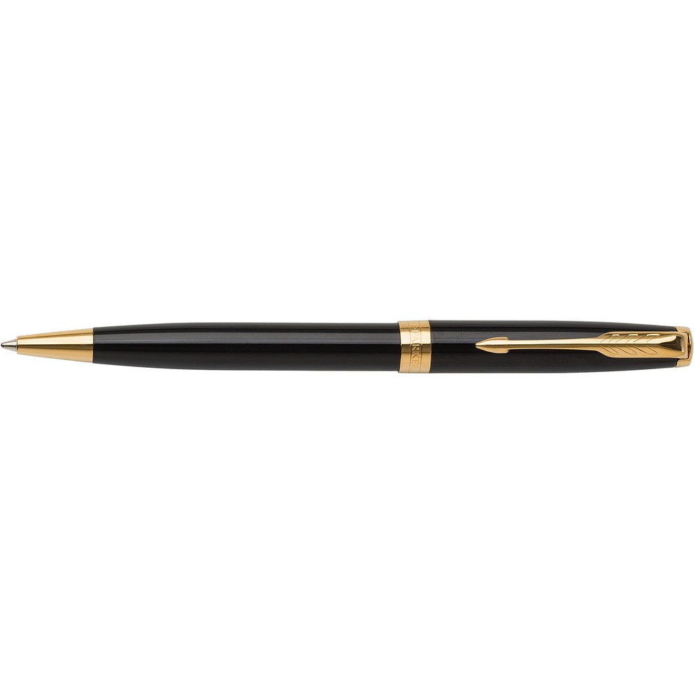 Шариковая ручка Parker Sonnet с механизмом поворота, пишет черным цветом, упакована в подарочную коробку, изготовлена из металла и нержавеющей стали.