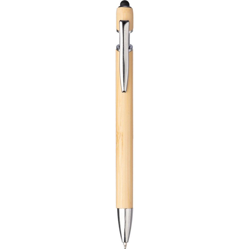 Шариковая ручка с металлическим наконечником, может быть прикреплена к блокноту или рубашке, пишет синим цветом, изделие изготовлено из бамбука.