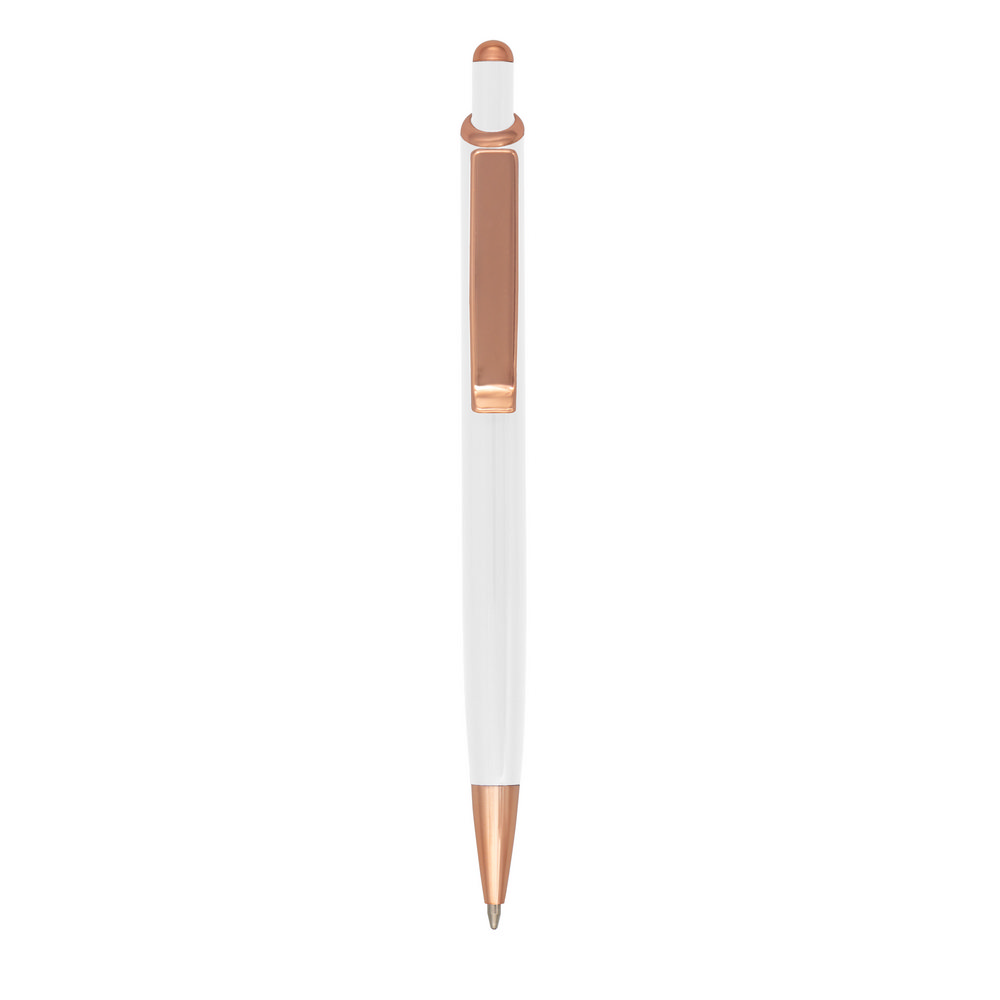 Шариковая ручка с цветным корпусом и блестящими деталями в розовом цвете, пишет синим, изготовлена из алюминия.
