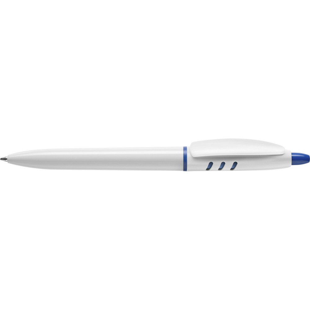 Шариковая ручка Stilolinea S30 с белым корпусом, цветными акцентами, пишет синим цветом, оснащена немецким чернилами Dokumental Ink, изготовлена из пластика ABS, никеля и металла.