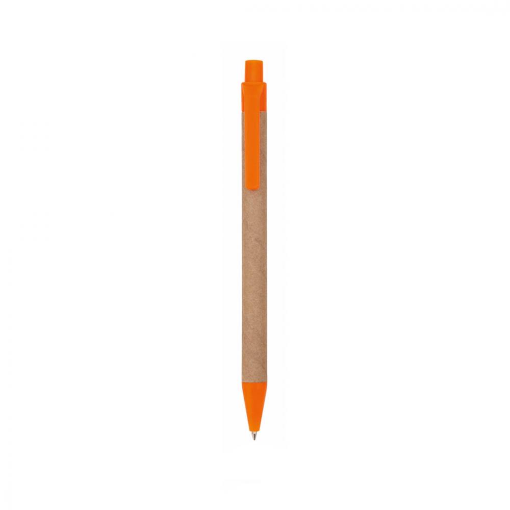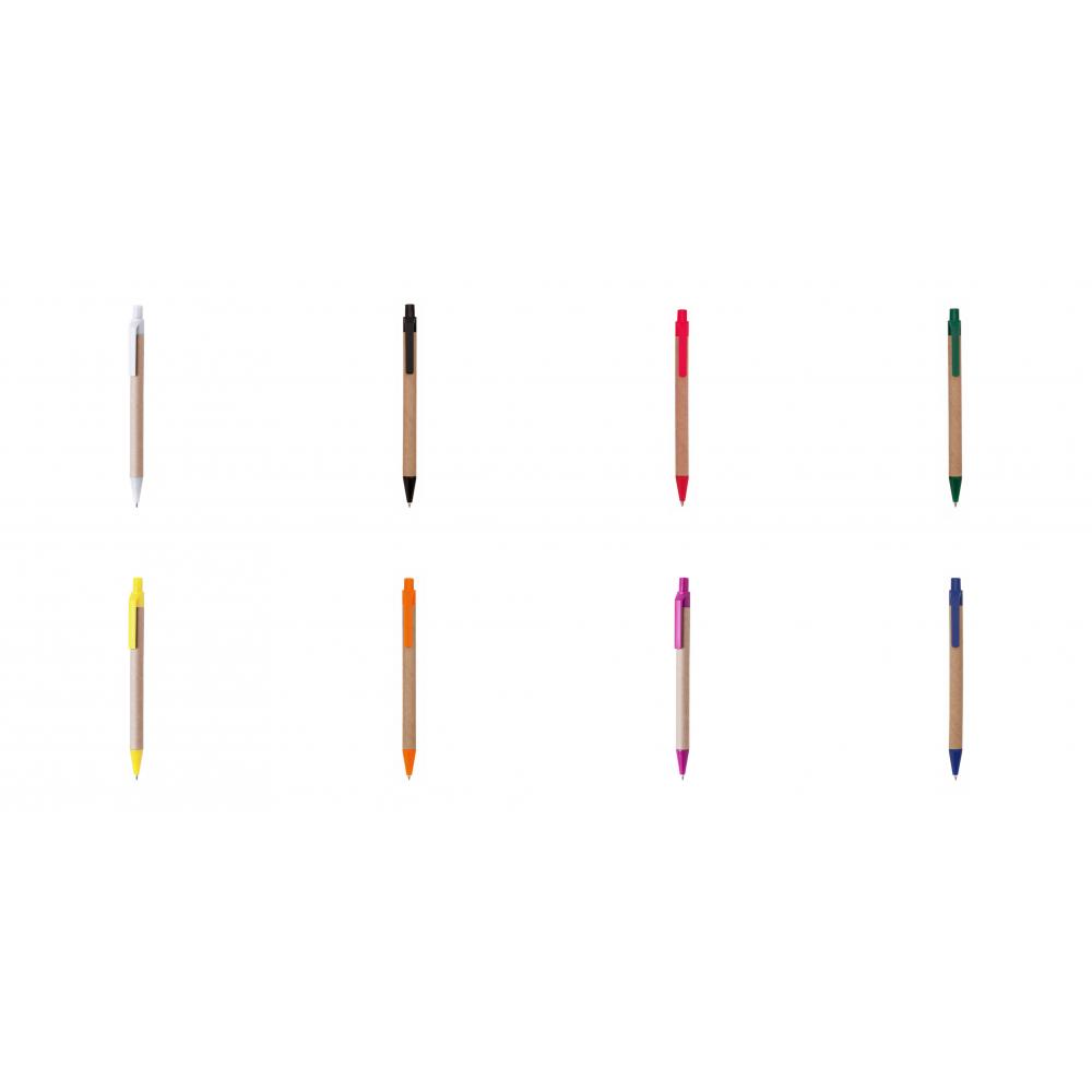 Шариковая ручка с нажимным механизмом в оригинальном сочетании корпуса из переработанного картона натурального цвета и аксессуаров ярких тонов. Синие чернила. Переработанный Картон