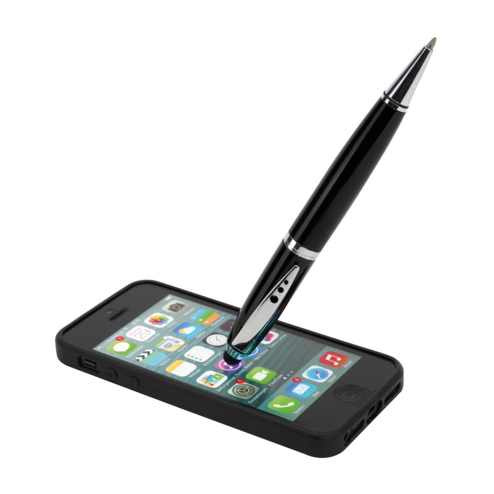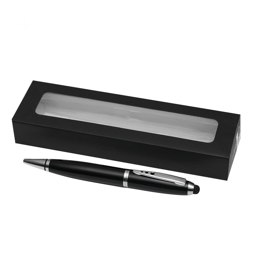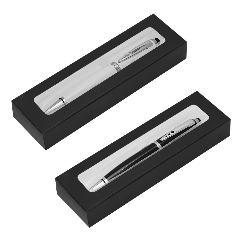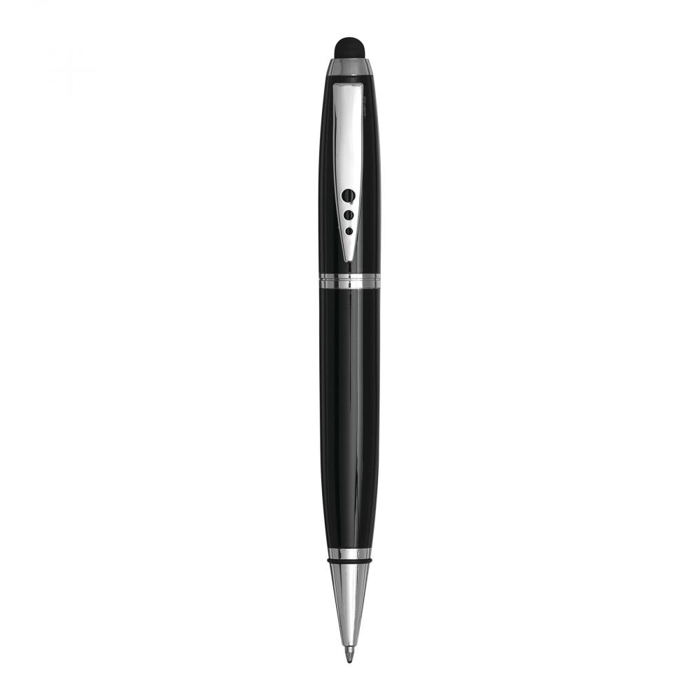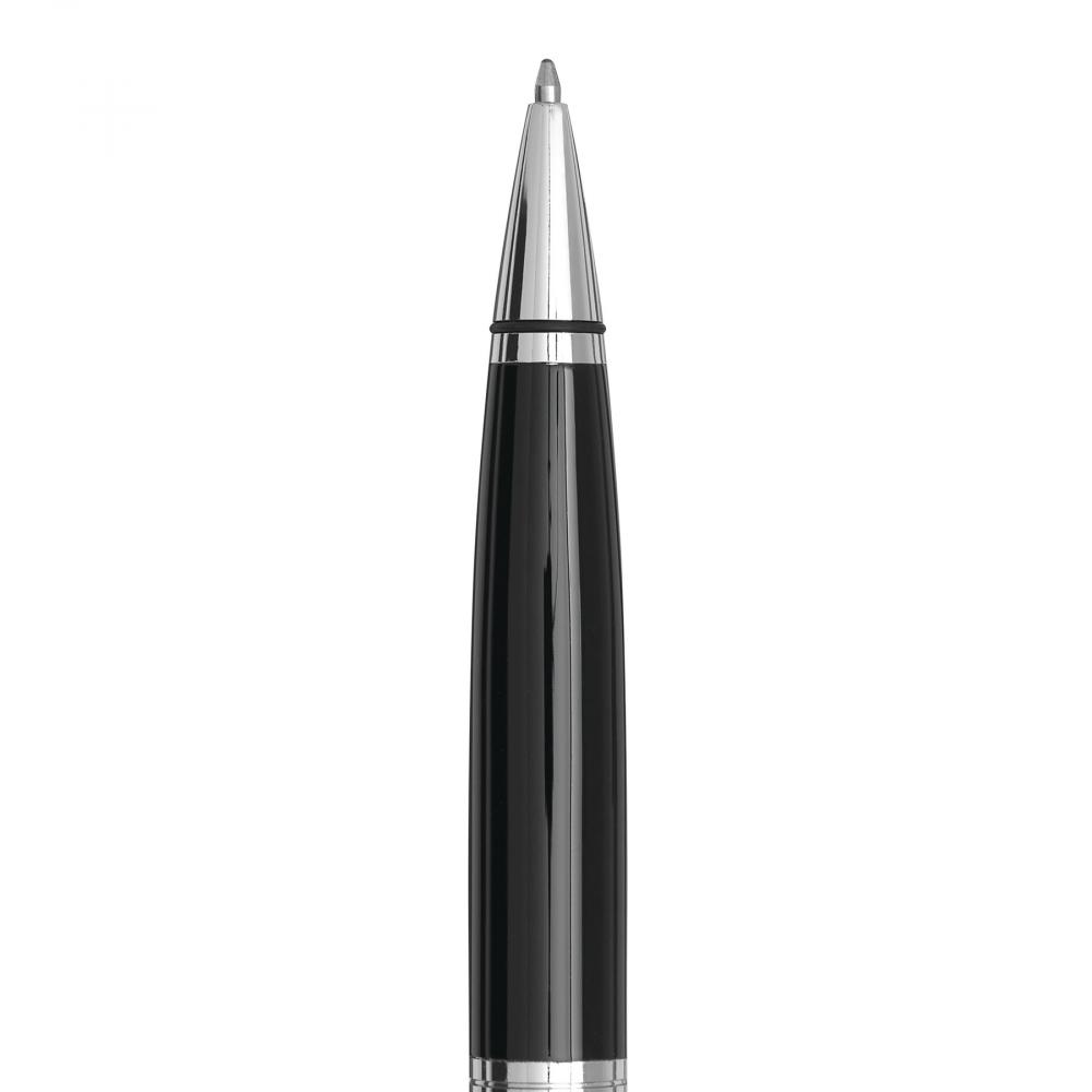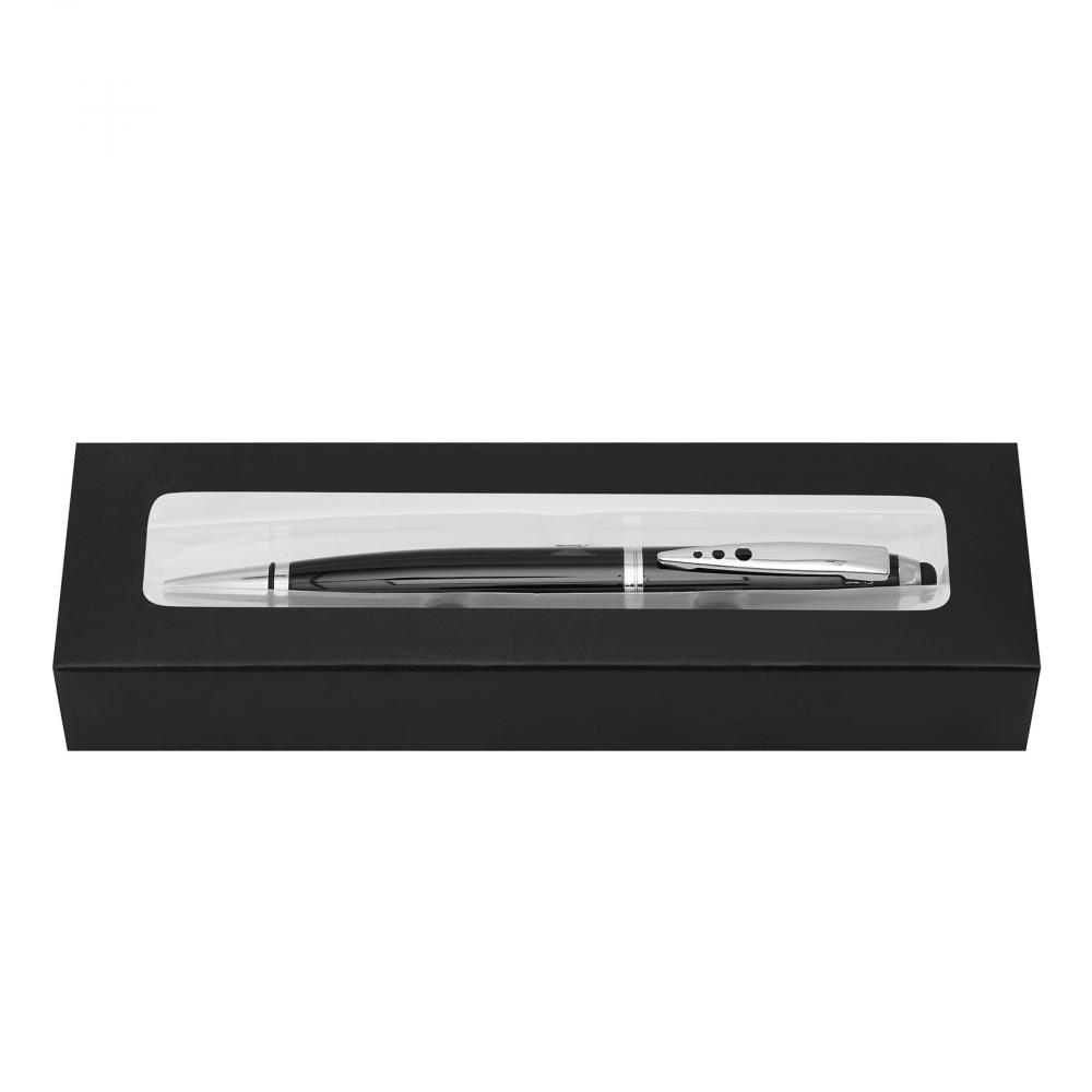 Ручка из нержавеющей стали TOUCH DOWN: с увеличенной емкостью заправки и поворотным механизмом, сенсорный наконечник на конце стержня, имитация черного рояльного лака с декоративными серебряными элементами, черными чернилами, упакована в подарочную коробку