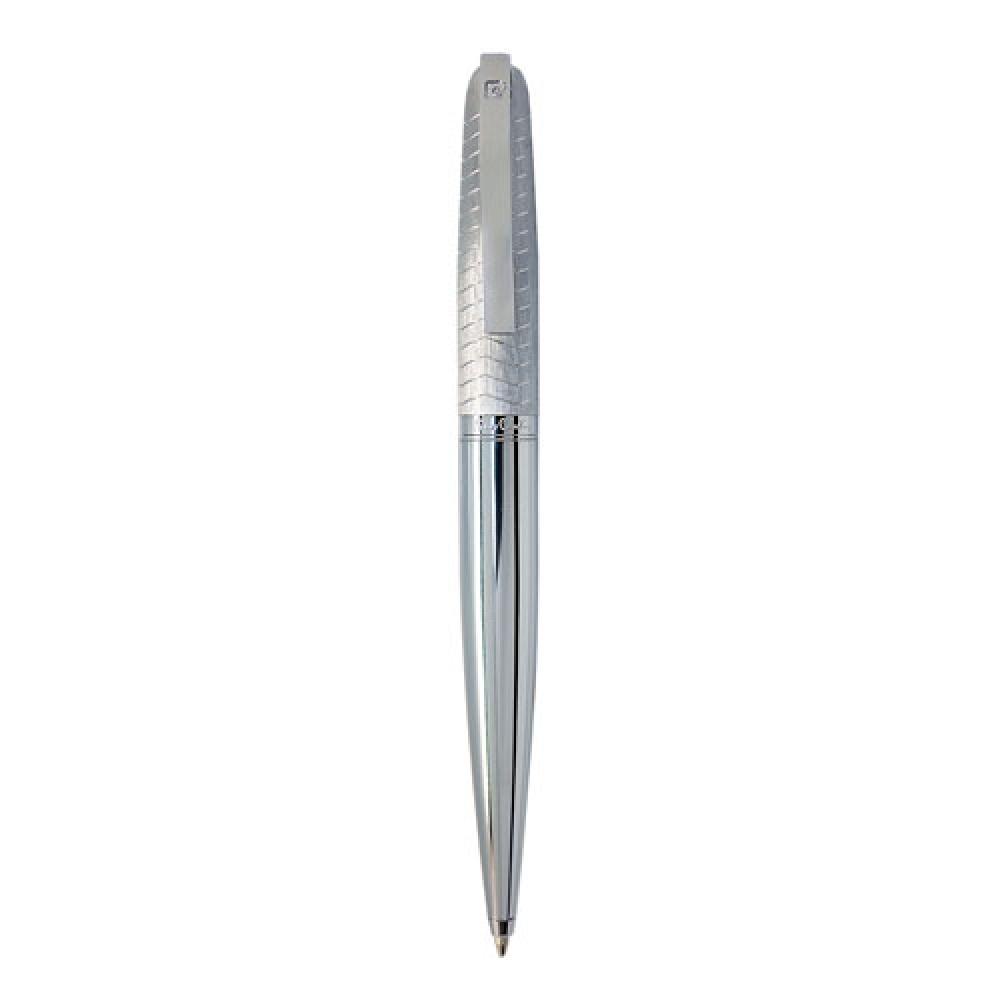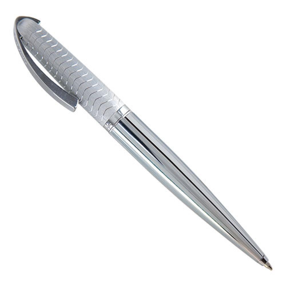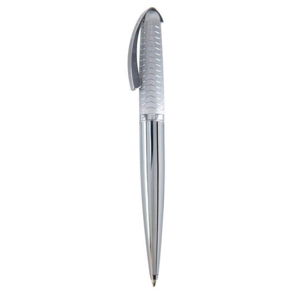 Металлическая шариковая ручка с поворотным механизмом закрытия, выполненная из текстурированного матового металла с волнообразными украшениями. Оснащена оригинальной изогнутой клипсой. Поставляется в футляре.