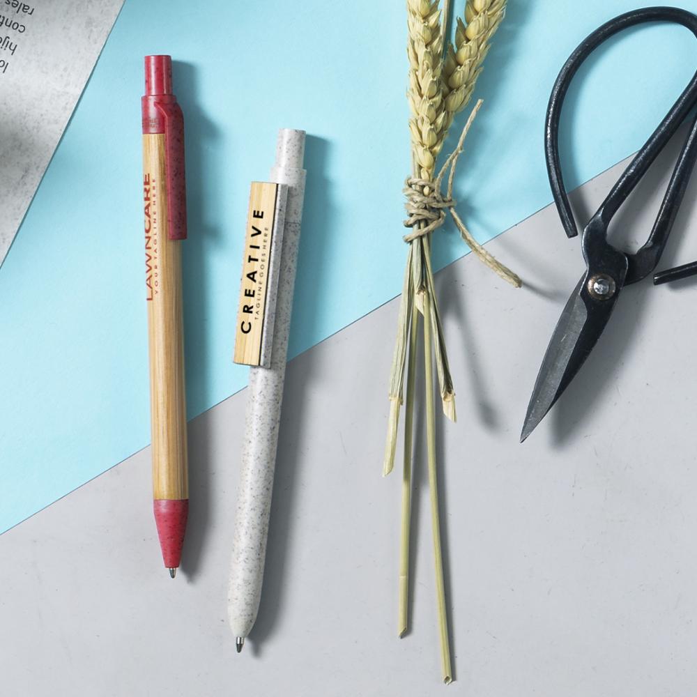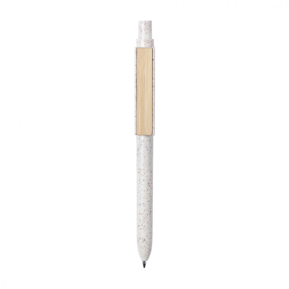 Шариковая ручка YUSIN с нажимным механизмом. Корпус выполнен из пшеничного тростника, с бамбуковым зажимом. Стержень с синими чернилами.