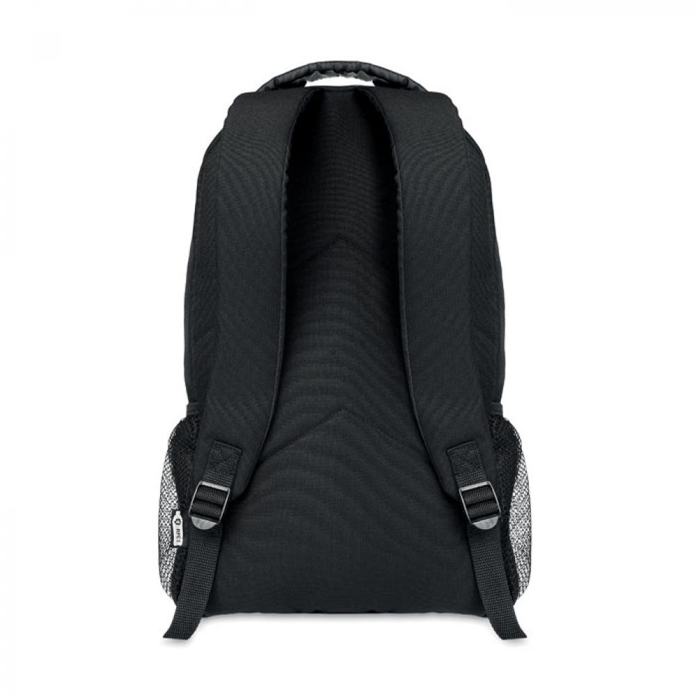 Рюкзак из RPET 600D с темными шнурками спереди и светоотражающей передней панелью. Сетчатые карманы с двух сторон.