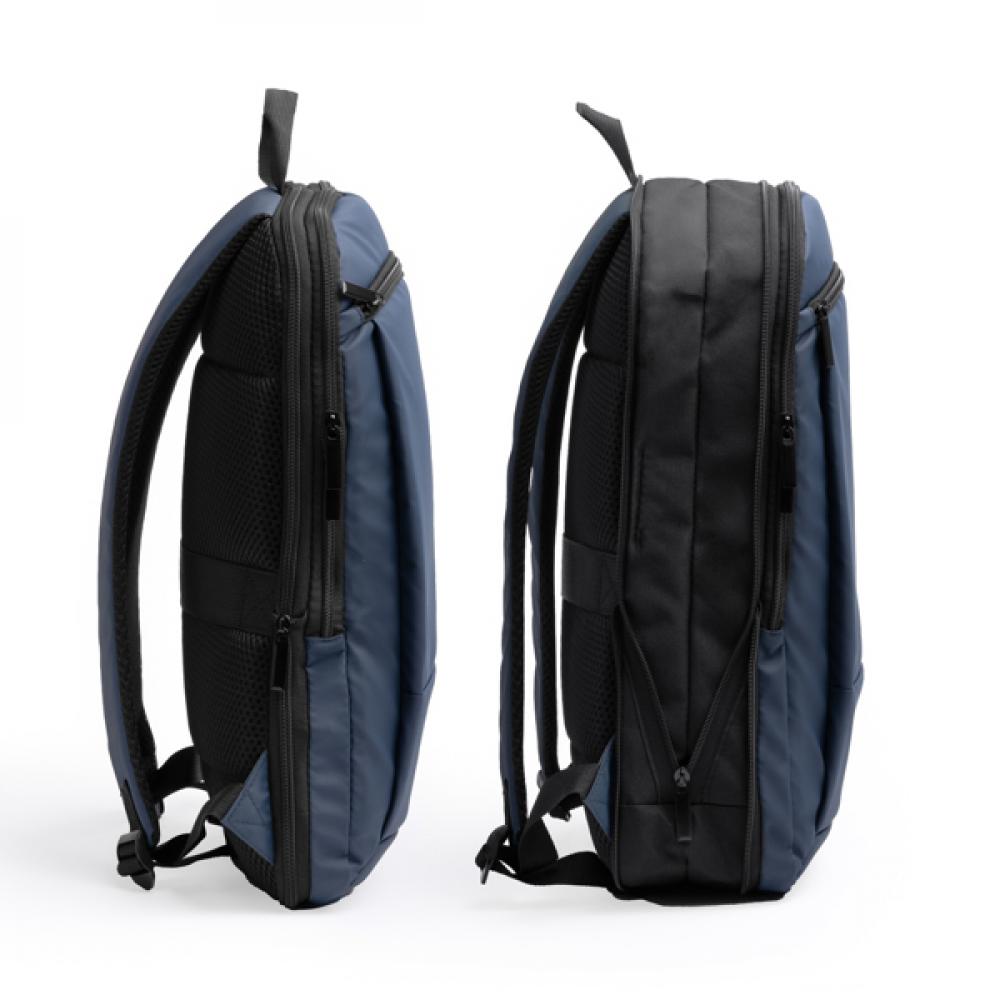 Расширяемый рюкзак из искусственной кожи PU и полиэстера RPET. Основное отделение с внутренним карманом на молнии для ноутбука до 17 дюймов. Два внешних кармана на молнии спереди и сбоку. Ремень для крепления к чемодану. Вместимость: 15 л.