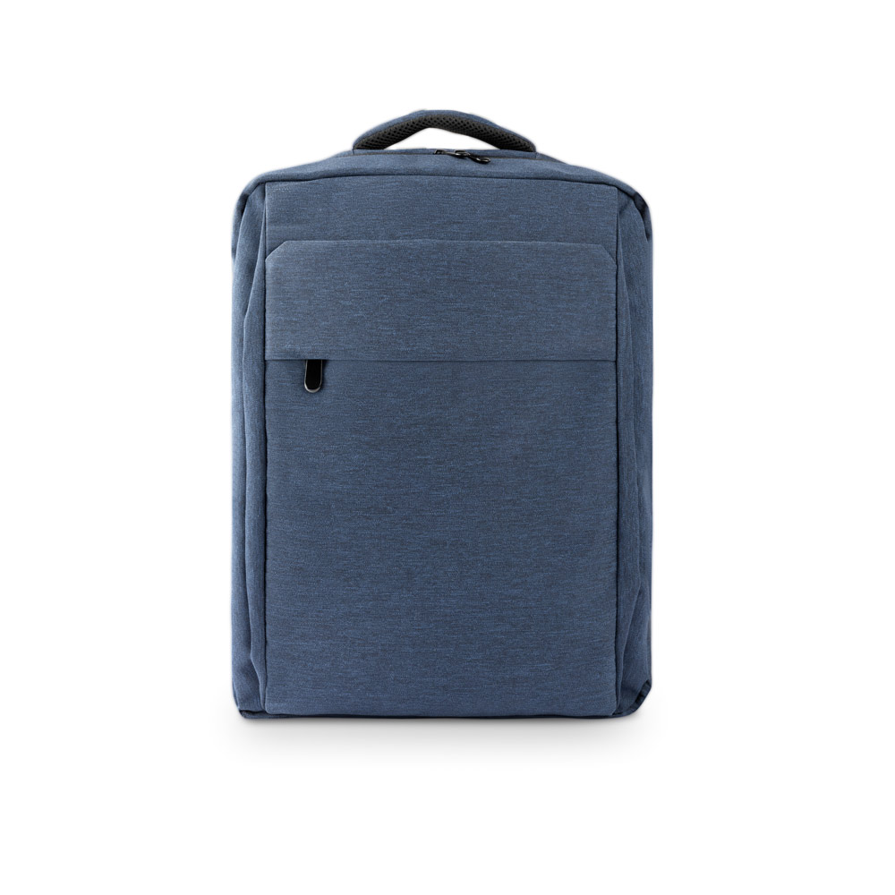 Рюкзак для ноутбука выполнен из переработанного полиэстера высокой плотности 300D и подкладки из переработанного полиэстера 210D. В нем есть основное отделение для ноутбука диагональю до 15,6 дюймов и несколько карманов. 2 передних кармана на молнии и 1 боковой карман для переноски бутылочки. На случай необходимости сзади имеется ремень-тележка. Вместимость до 18 л. 300 x 430 x 140 мм
