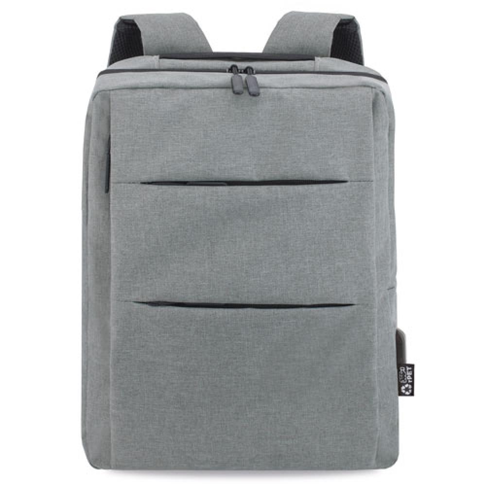 Рюкзак из материала rPET. Внутри находится несколько отделений, подходящих для ноутбуков до 17", а также мягкие плечевые ремни. Включает USB-разъем для зарядки. Также имеется эластичное крепление для переноски на тележке. Доступен в черном, сером и темно-синем цветах. Каждый рюкзак упакован в индивидуальный пакет с самозакрывающимся клапаном.