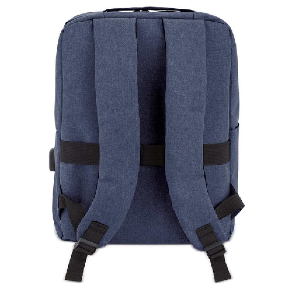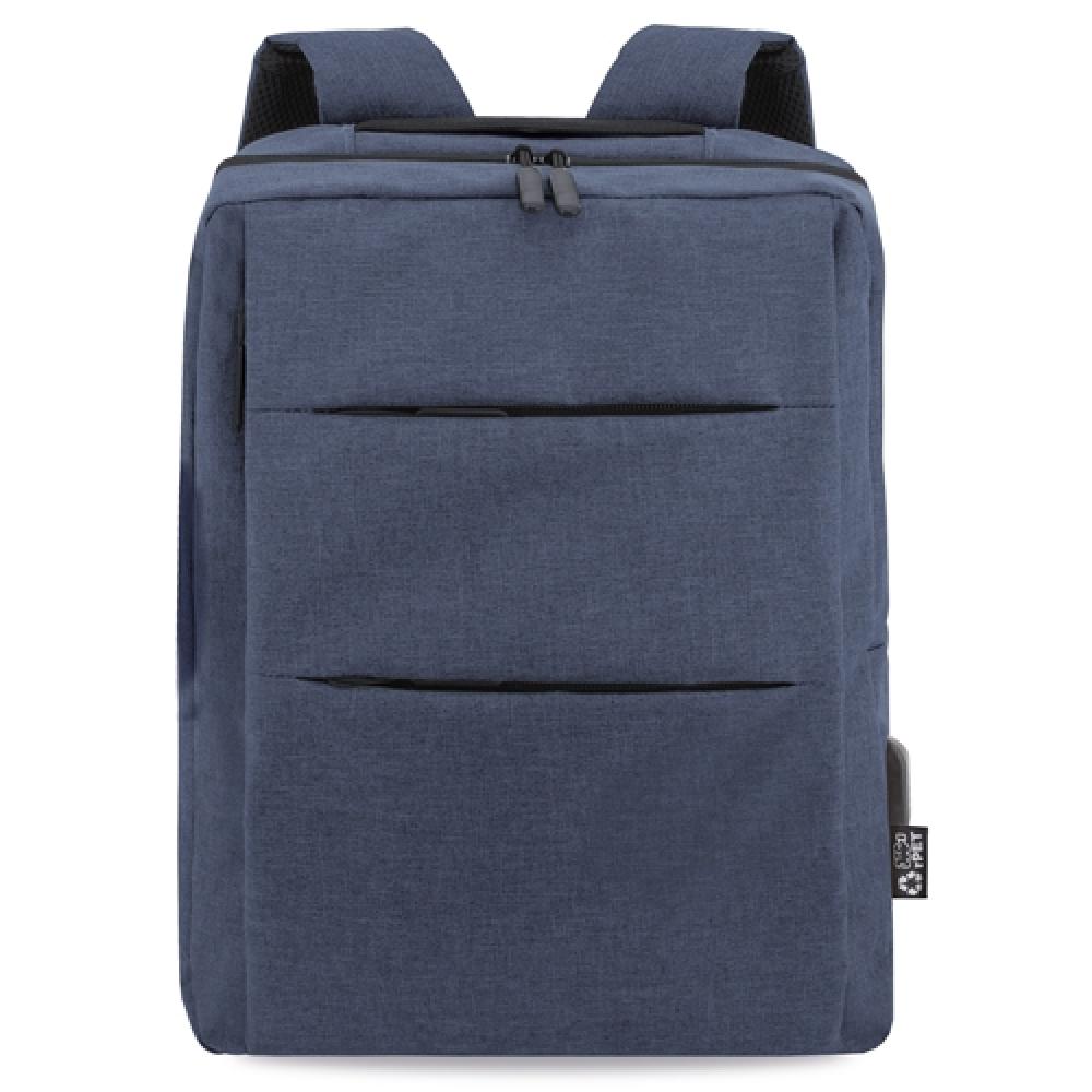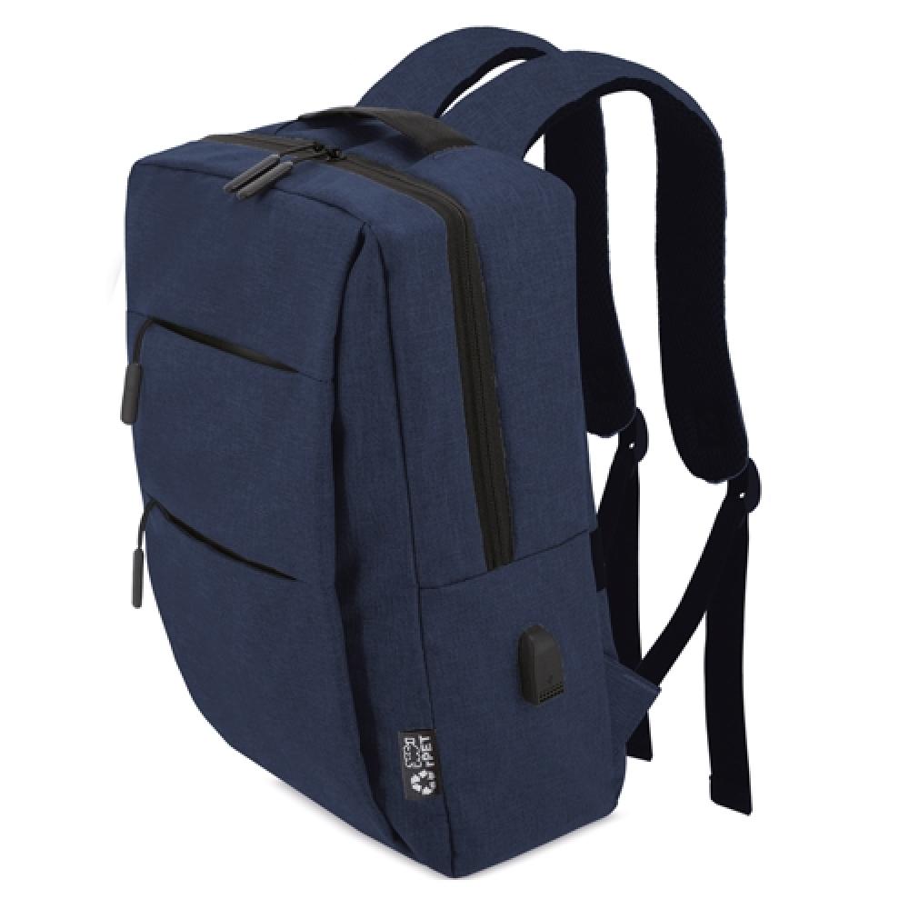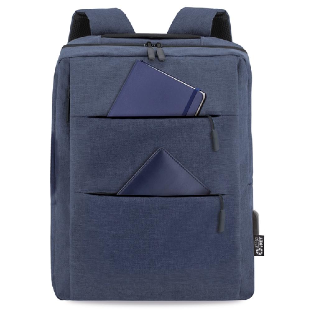 Рюкзак из материала rPET. Внутри находится ряд отделений, подходящих для ноутбуков до 17", а также внутренние и мягкие плечевые ремни. Включает USB-разъем для зарядки. Также имеется эластичное крепление для перевозки на тележке. Доступен в черном, сером и темно-синем цветах. Каждое изделие представлено в индивидуальной самозакрывающейся упаковке.