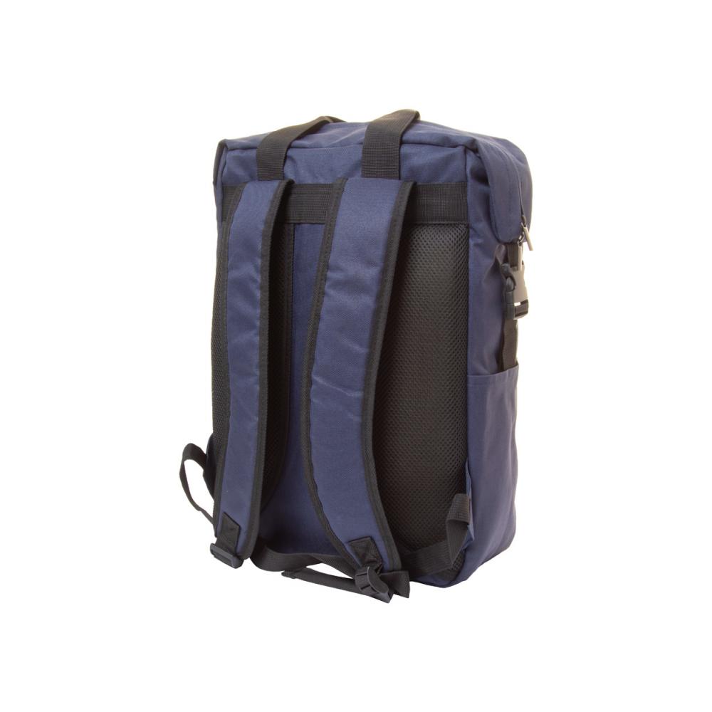 Рюкзак из RPET с застежкой на молнии основного отделения и передним карманом, подкладкой для ноутбука (15") и планшета (10"), боковыми ремнями и карманами, подкладкой на спине и плечевыми ремнями. Полиэстер RPET 600D с характерным ярлыком RPET.