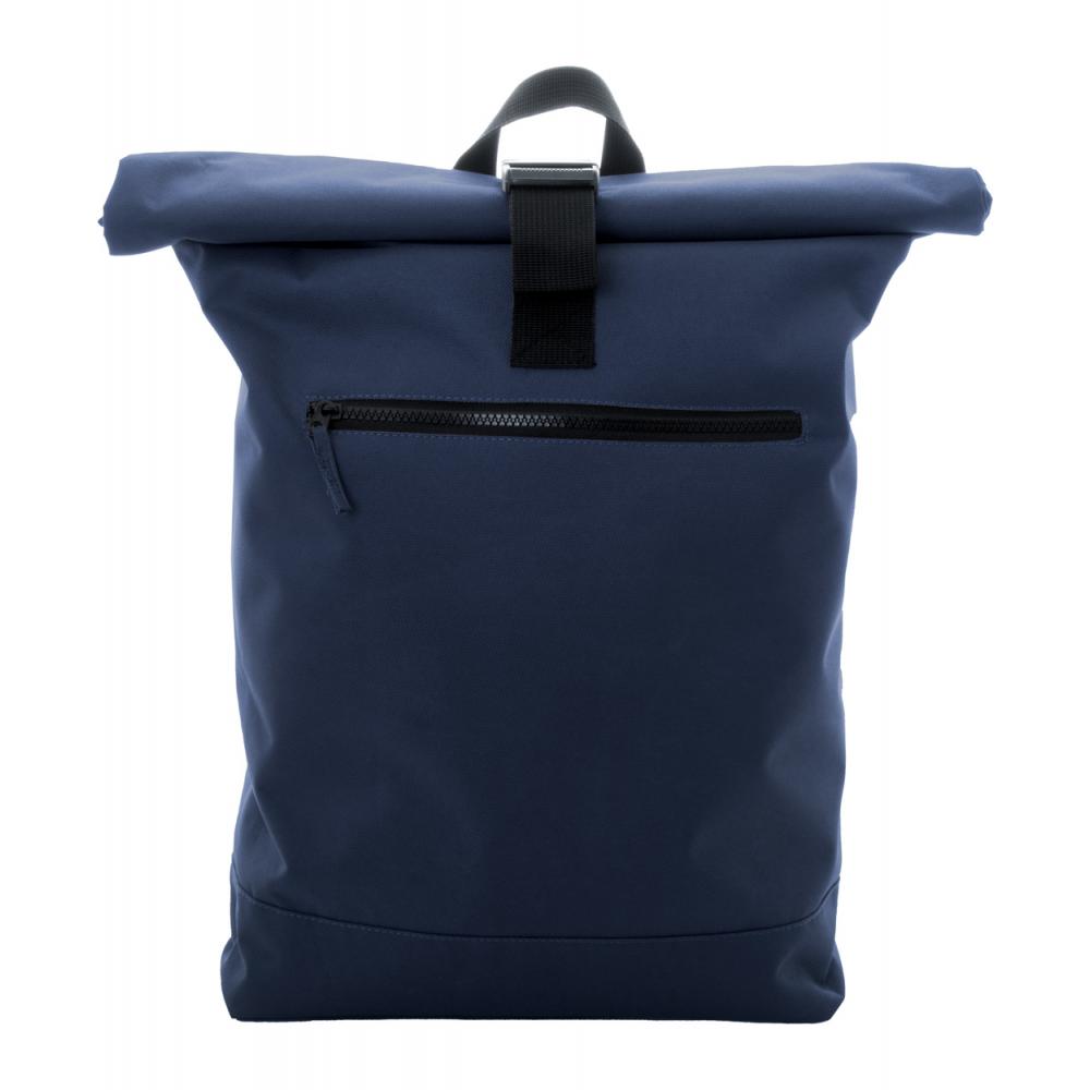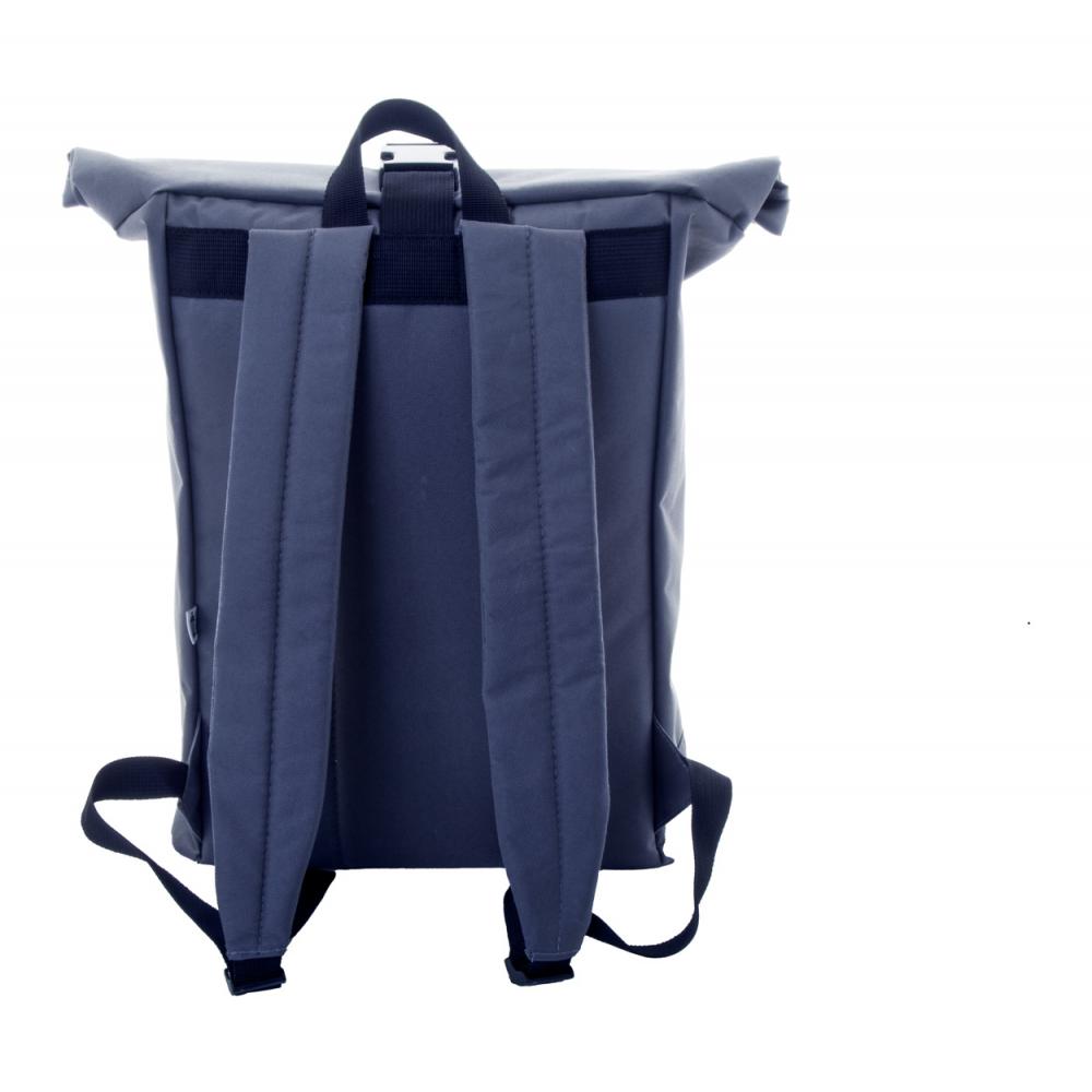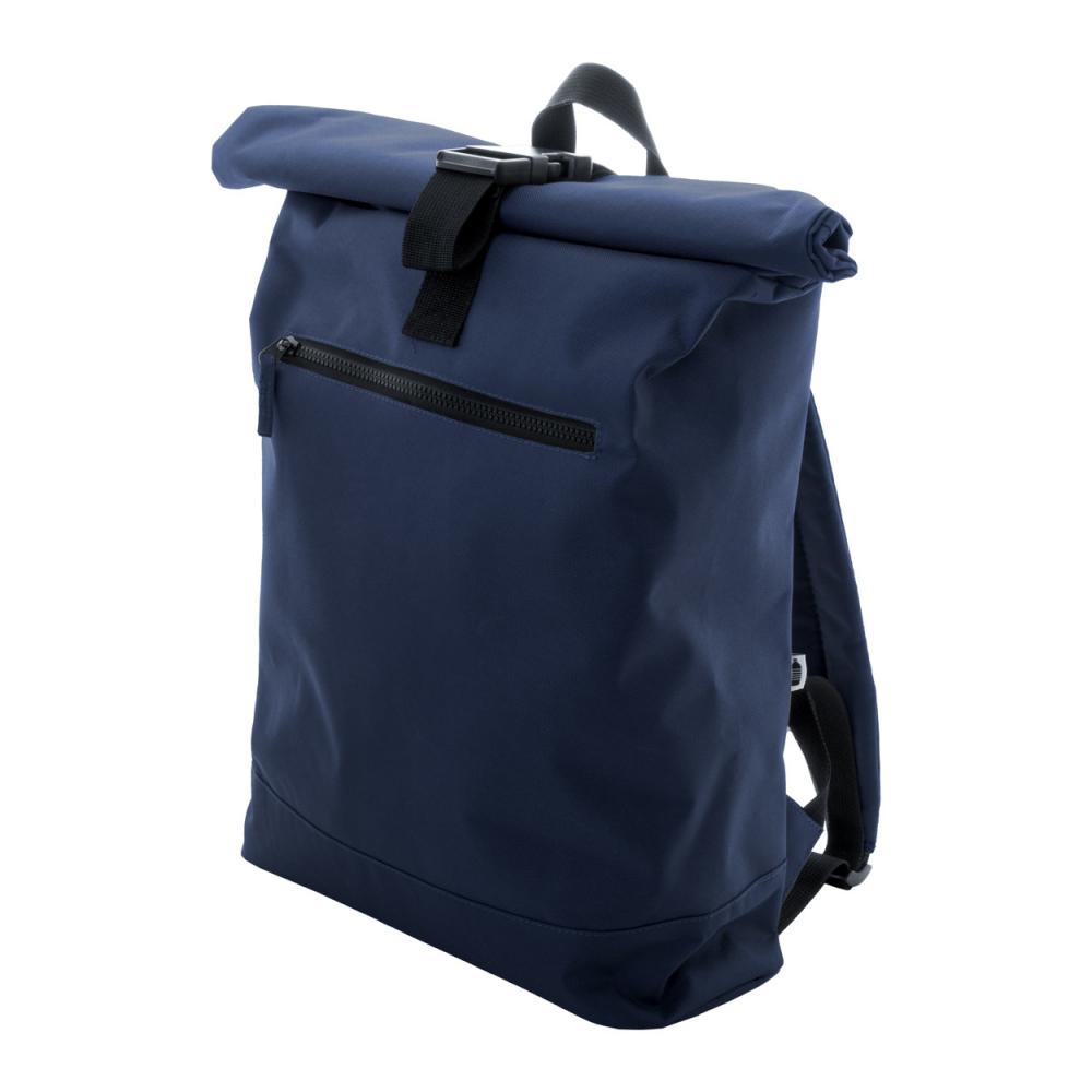 Рюкзак RPET с застежкой на пряжке, передним карманом на молнии, отделением для ноутбука (15") с подкладкой, подкладкой на спине и плечевыми ремнями. 600D RPET полиэстер с характерным ярлыком RPET.