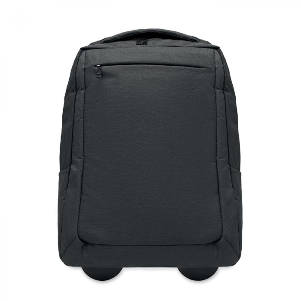 Рюкзак на колесах для ноутбука 15 дюймов из переработанного полиэстера 600D. Включает одно внутреннее отделение для 15-дюймового ноутбука. Передний карман на молнии. Два боковых накладных кармана. Три внутренних накладных кармана. Спинка и плечевые ремни с мягкой подкладкой. 2 колеса и двойная трубчатая рама.