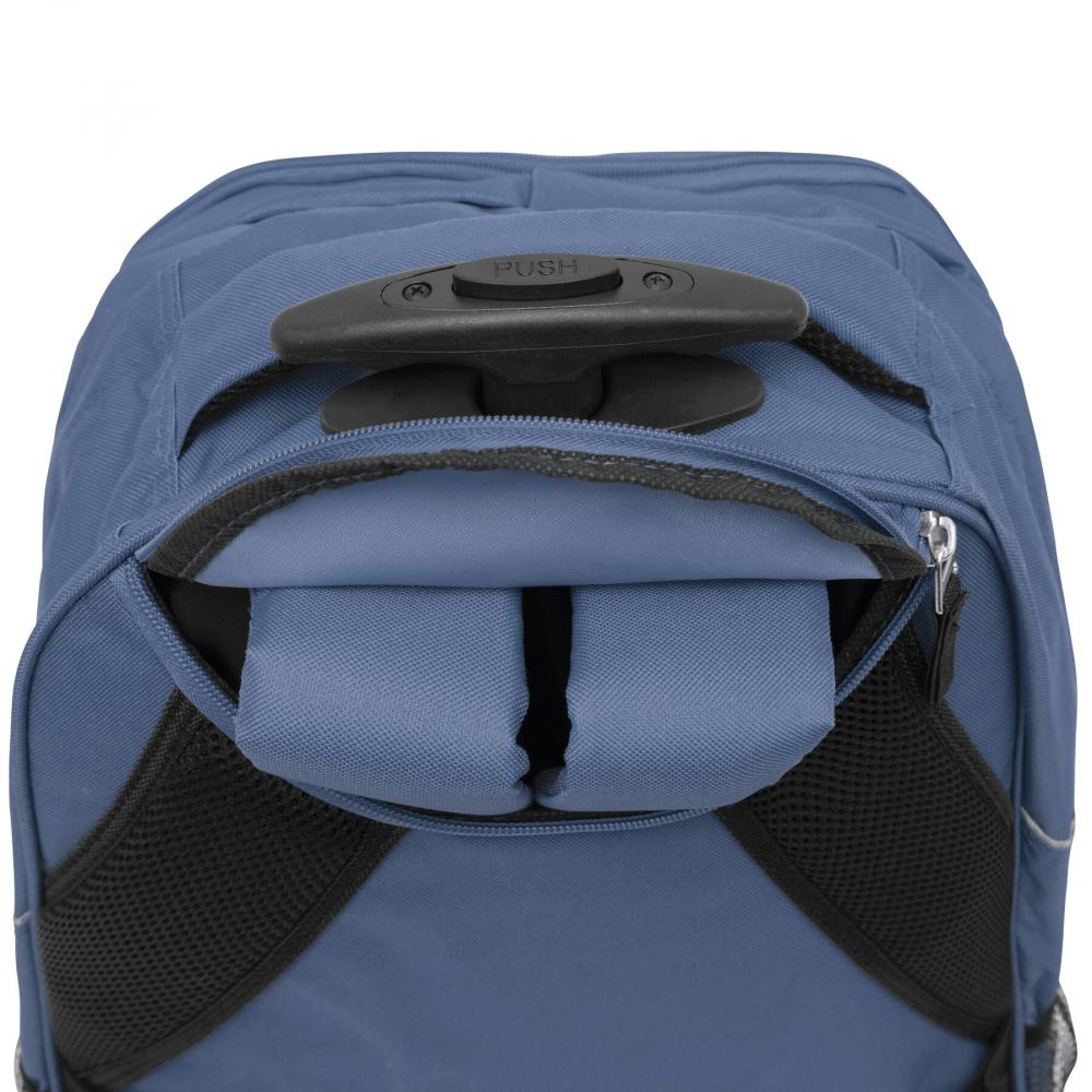 Рюкзак на колесиках TRAILER: маленький передний карман на молнии, большой передний карман на молнии с органайзером, основное отделение на молнии с мягким карманом для ноутбука, 2 боковых сетчатых кармана, мягкая спинка и плечевые ремни, карман на молнии для хранения плечевых ремней, с телескопической ручкой, ручка для переноски, 2 легко ходящих колеса, включая защиту одежды