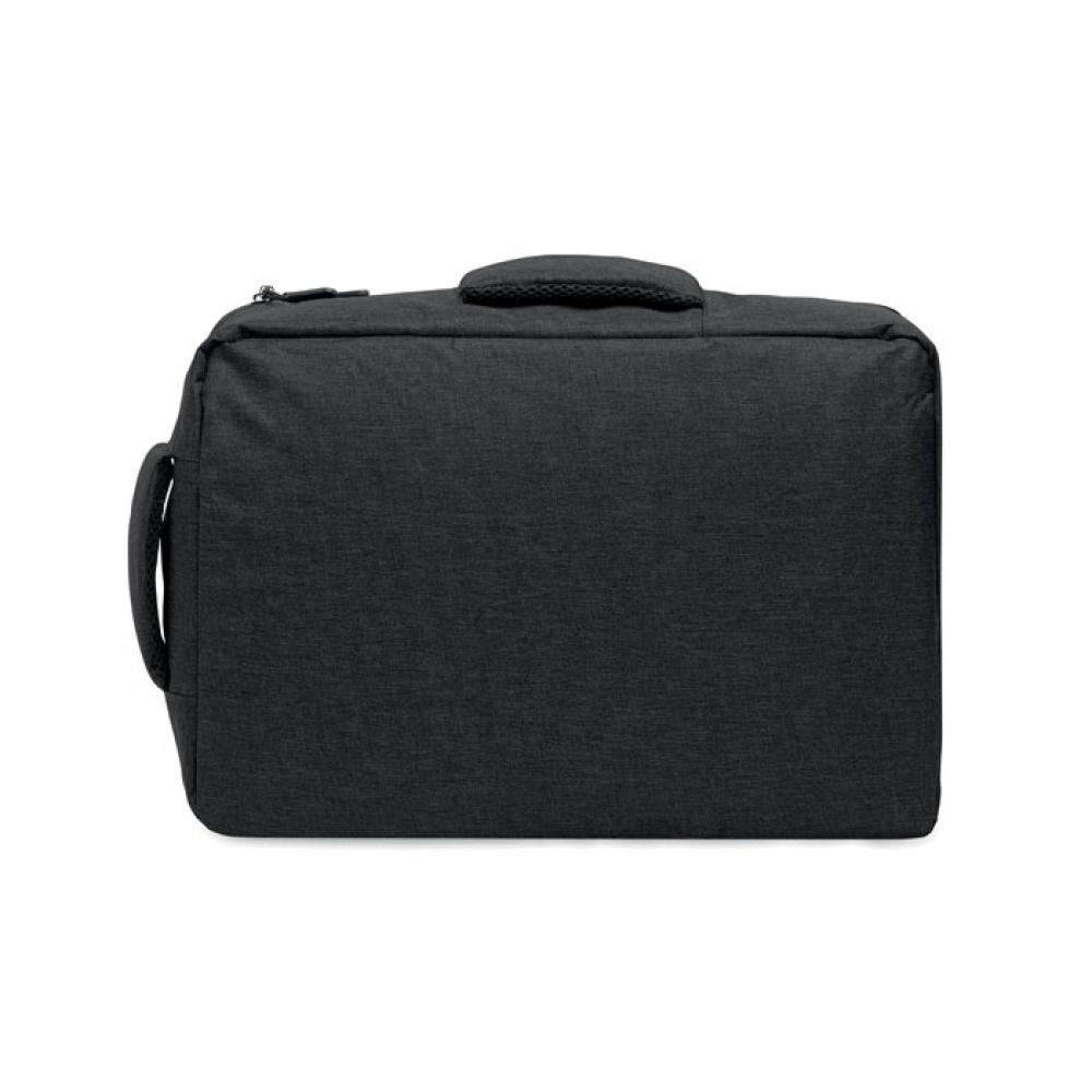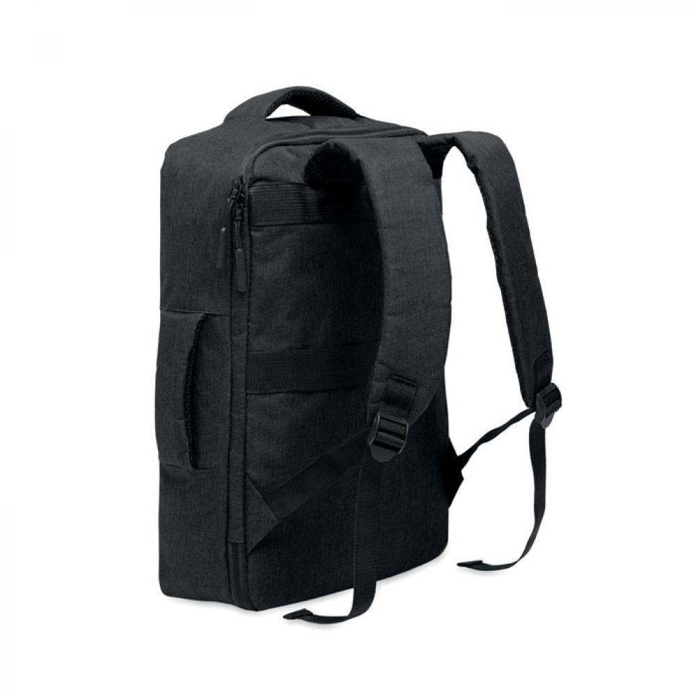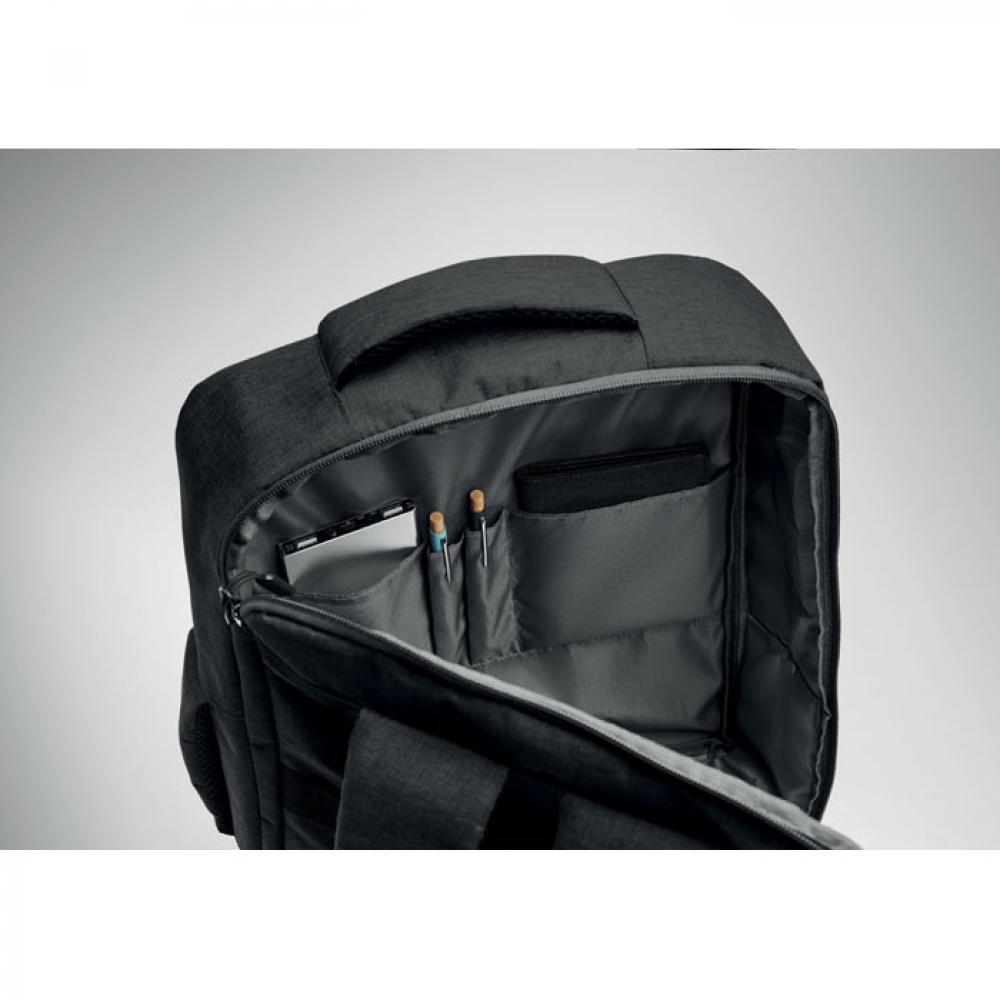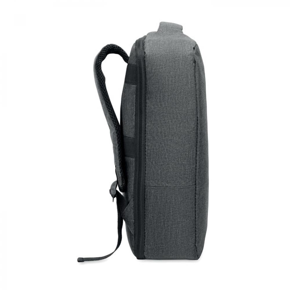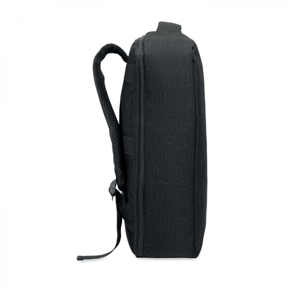 Тонкий рюкзак для ноутбука с диагональю 15 дюймов из переработанного материала 300D RPET и подкладкой из 210D RPET. Включает отделение для ноутбука, 2 внутренних кармана, 2 внутренних отделения для ручек и 2 мягкие ручки для переноски. Спинка и плечевые ремни с мягкой подкладкой. Крепление для чемодана на обратной стороне.
