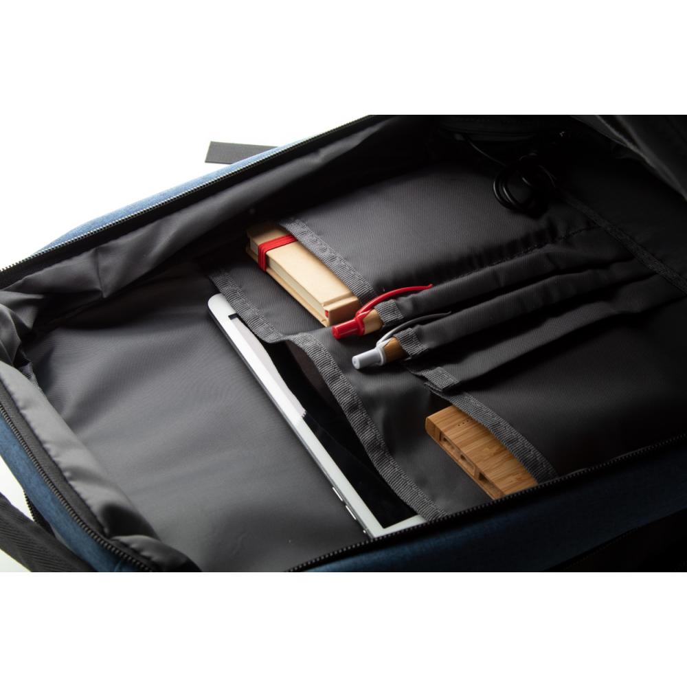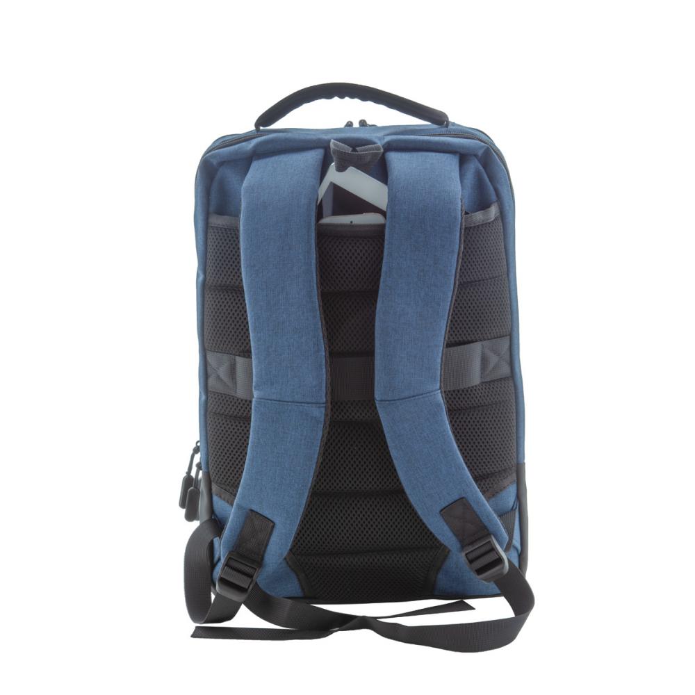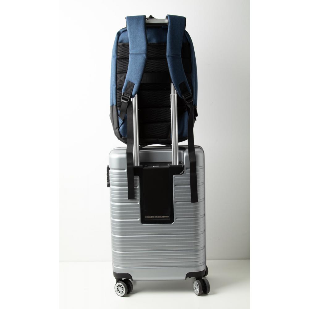 Двухцветный рюкзак с несколькими отделениями на молнии, внутренними карманами-органайзерами, отделением для ноутбука (17 дюймов) с мягкой подкладкой, эргономичной спинкой и плечевыми ремнями. С противоугонным карманом, ремнем на тележке и встроенным USB-разъемом для аккумуляторов. Полиэстер 400D.