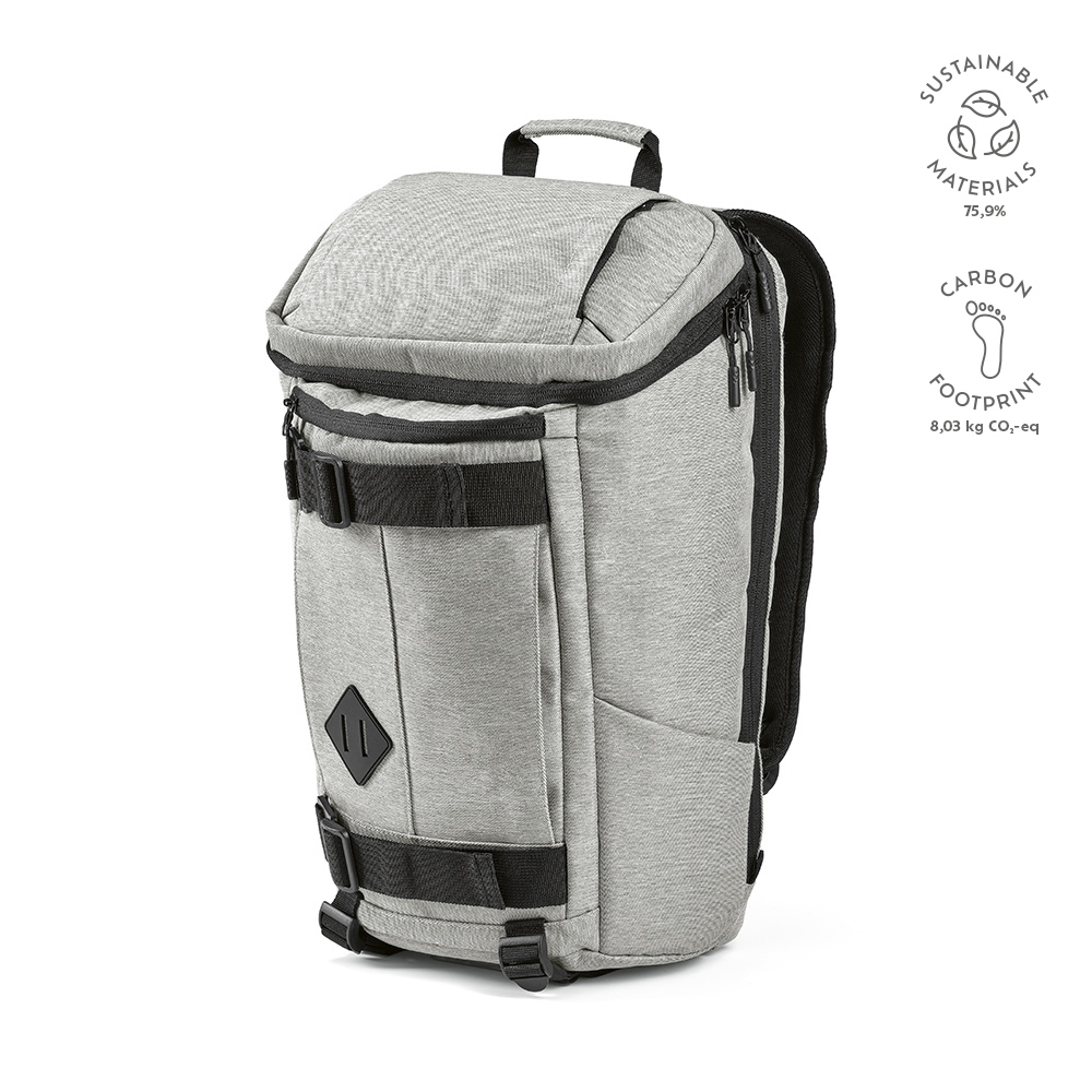 Изготовленный из переработанного ПЭТ, наш рюкзак является примером экологичного дизайна. Он оснащен скрытыми боковыми карманами, передними и нижними петлями для дополнительного хранения и имеет объем 20 литров. На спинке предусмотрена лента для крепления к чемодану. Каждый рюкзак упакован в индивидуальный пакет из переработанного полиэтилена.