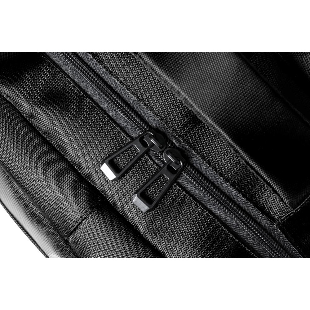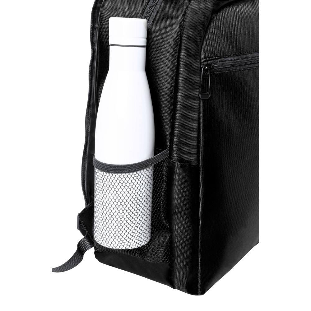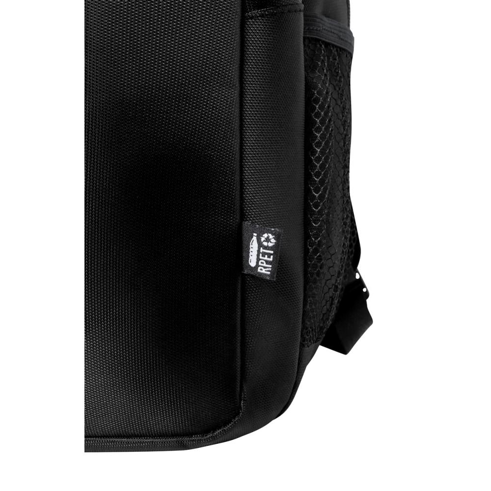 Рюкзак RPET с отделениями на молнии, сетчатыми боковыми карманами, мягким карманом для ноутбука (15 дюймов), ремнем-тележкой, мягкими спинкой и плечевыми ремнями. Полиэстер 420D RPET с отличительной этикеткой RPET.