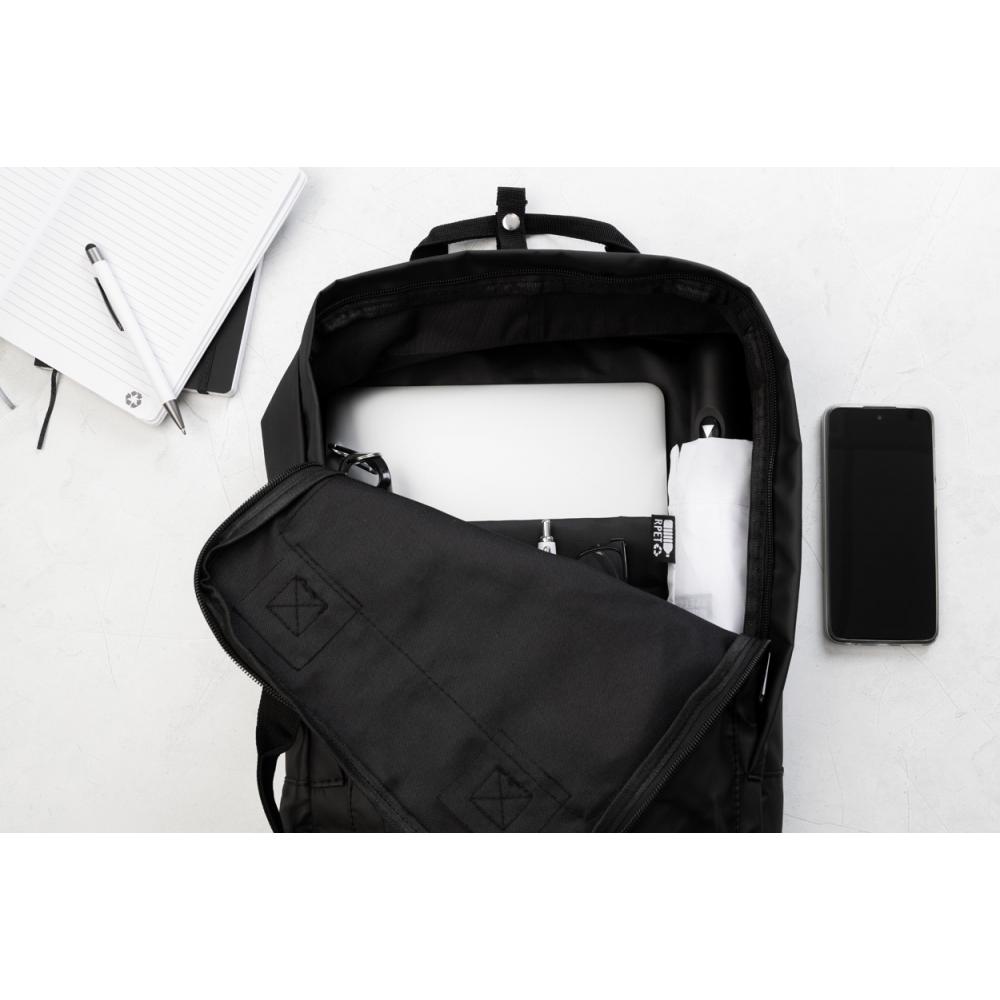 Водонепроницаемый, мягкий рюкзак из переработанной искусственной кожи с застежкой на молнии, 2 передними карманами на молнии, боковыми карманами и отделением для ноутбука (15") и планшета (10"). С мягкой спинкой и плечевыми ремнями. С характерным этикеткой из переработанной искусственной кожи.