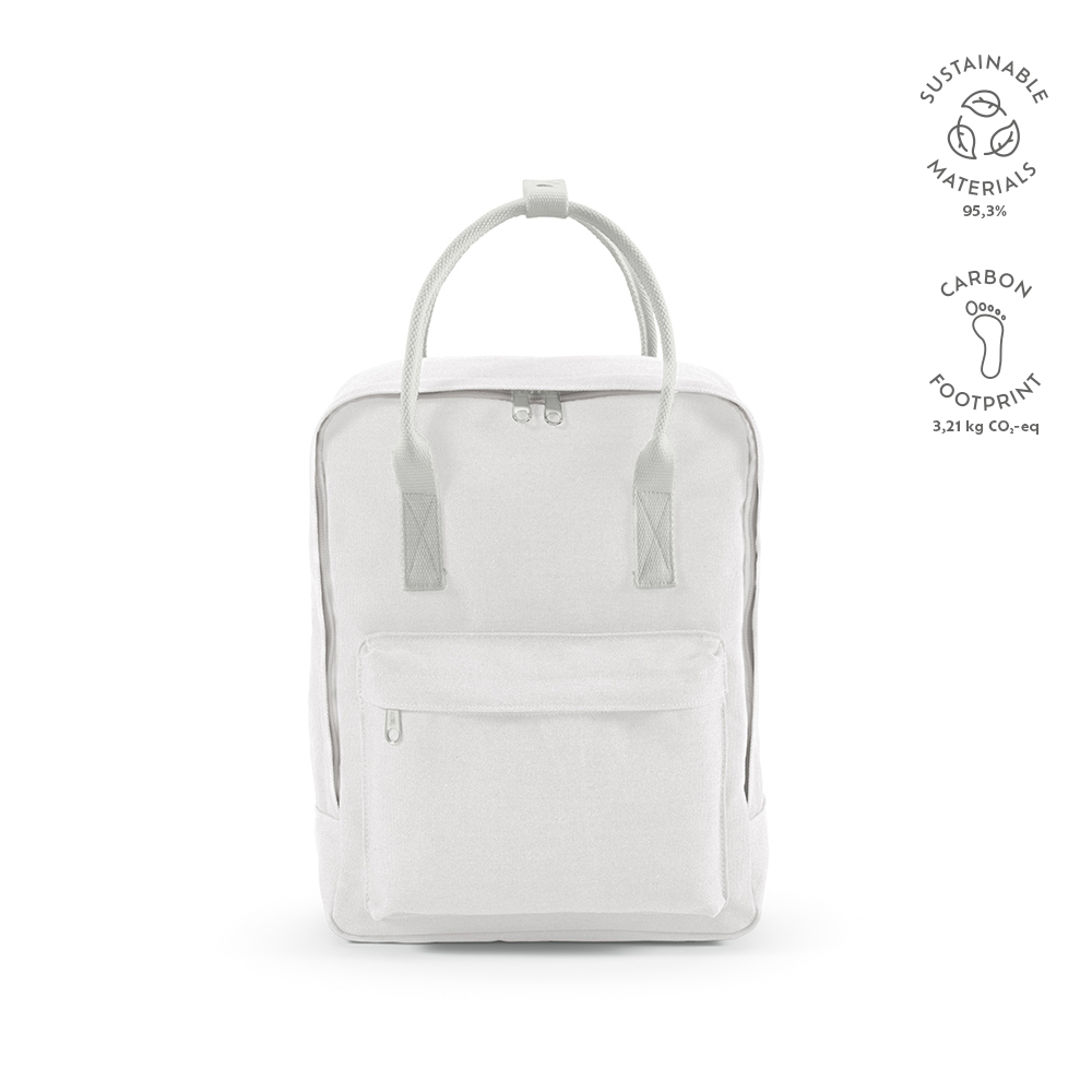 Изготовленный из переработанного хлопкового холста (450 г/м²), этот рюкзак является примером устойчивости с объемом 18 литров. Он оснащен двумя ручками для удобства и плечевыми ремнями из переработанного PET. Также имеется передний карман. Упакован в полиэтиленовый пакет из переработанного материала.