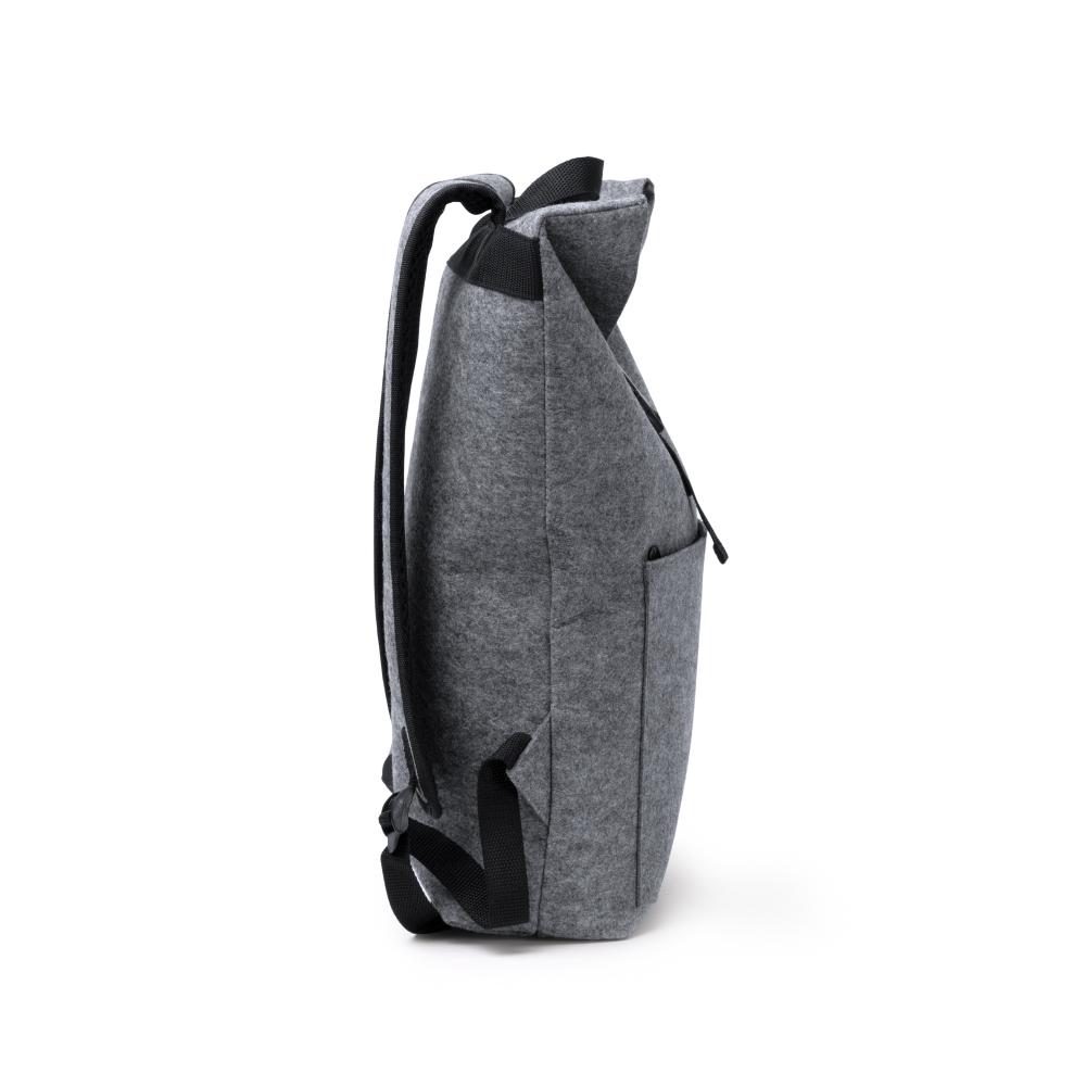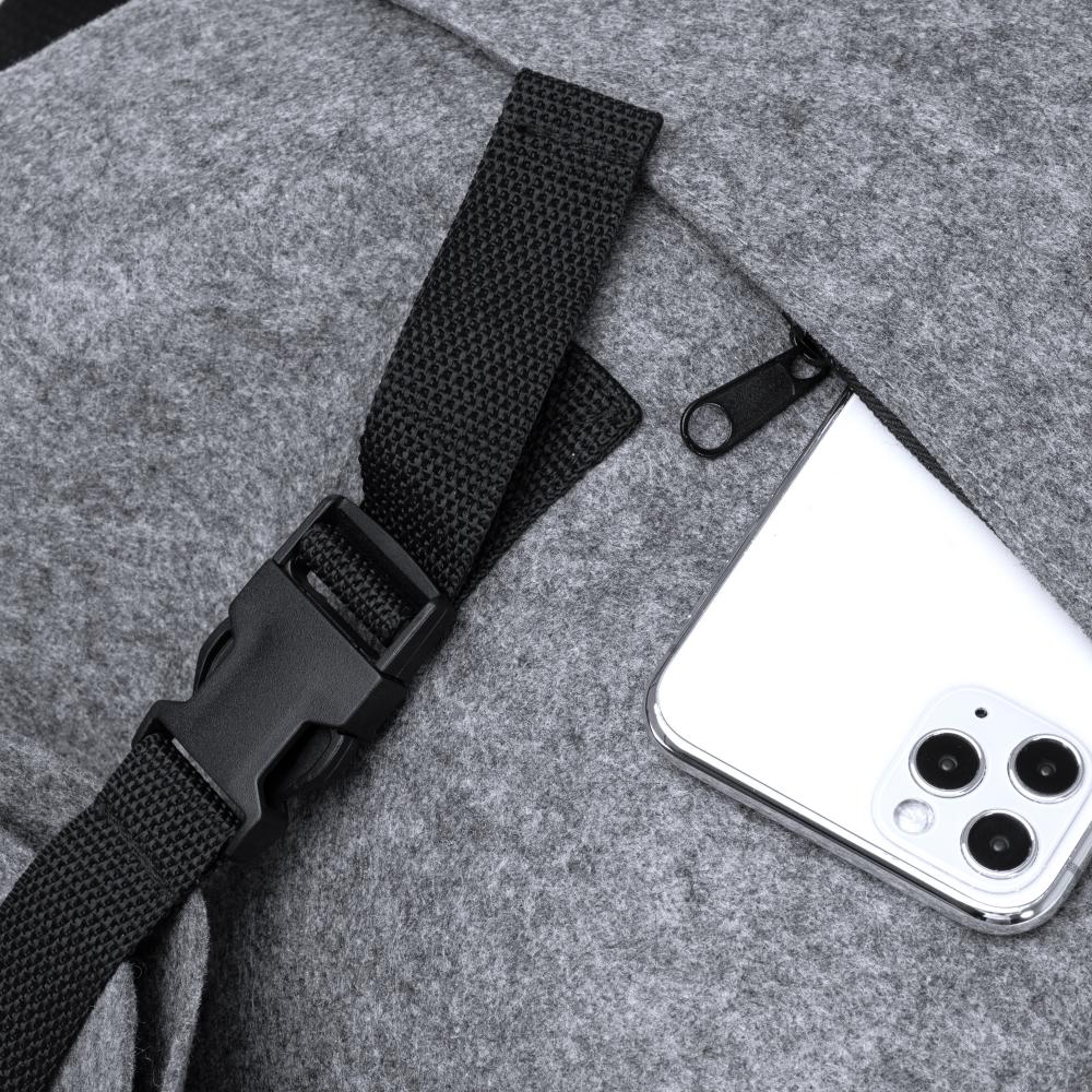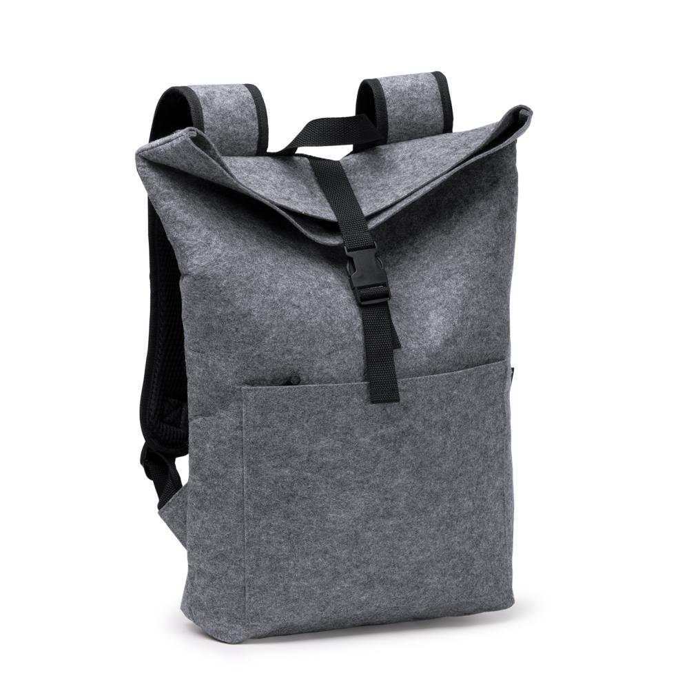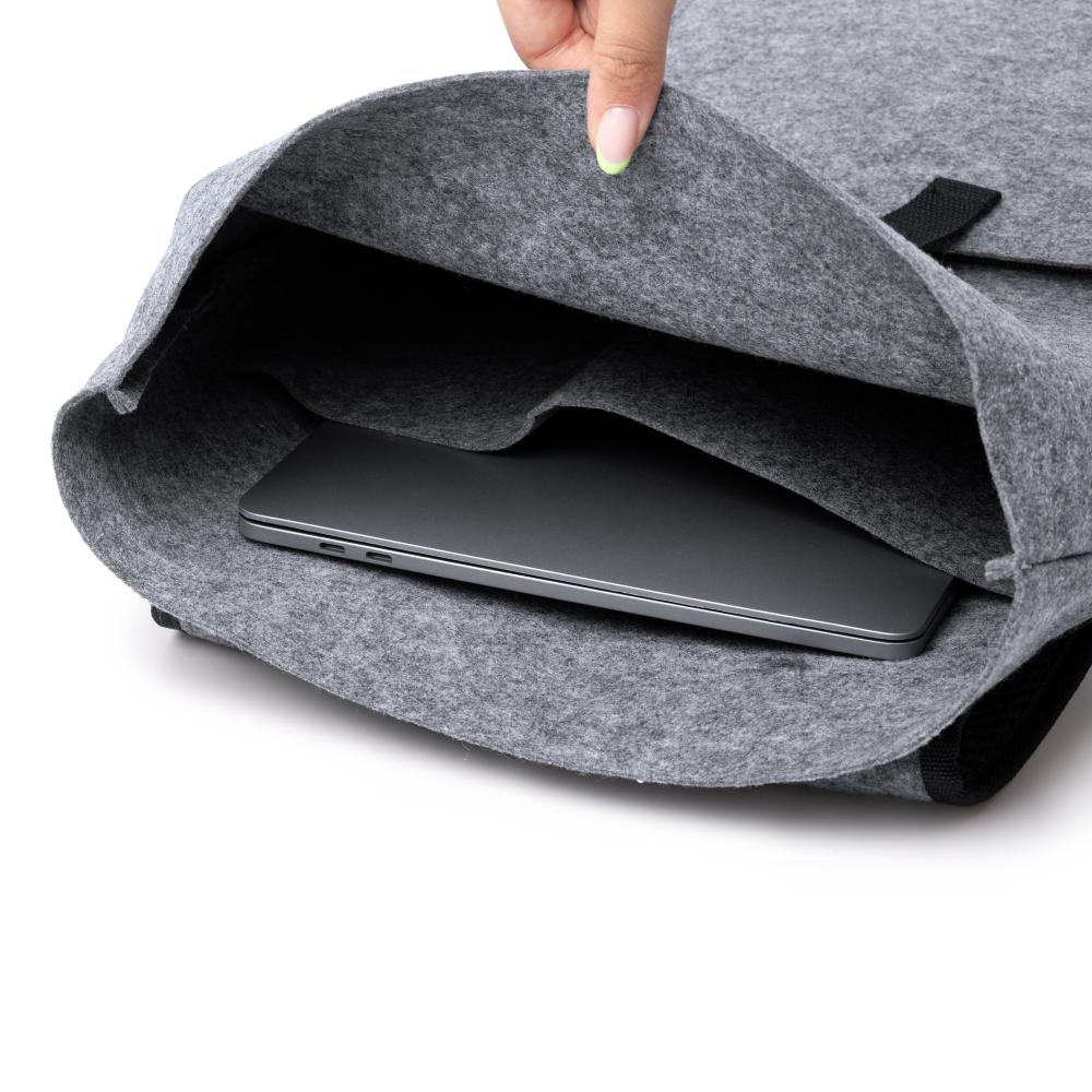 Рюкзак из переработанного войлока с клапаном. Основное отделение закрывается на карабин. Передний карман и регулируемые ручки.