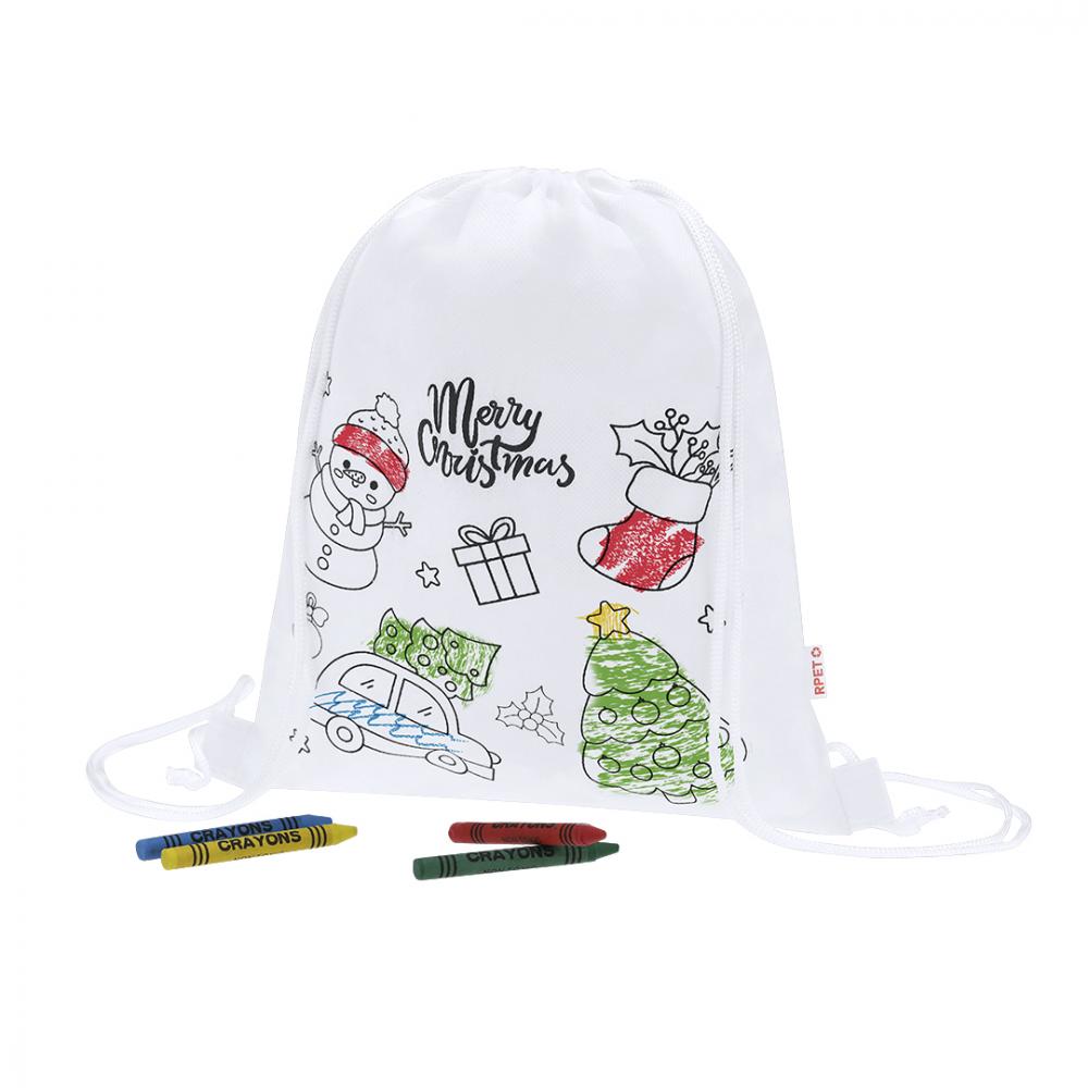 Детский рюкзак с рождественскими мотивами из нетканого материала RPET. Специально разработана для окрашивания воском. С 4 восками разных цветов. В нем есть самозатягивающиеся веревки и тканевые крепления. Включает значок RPET на этикетке