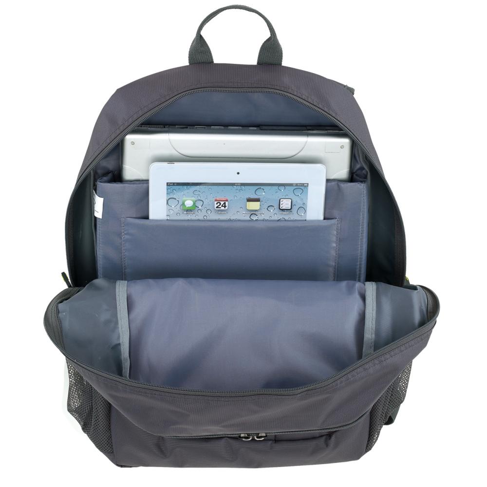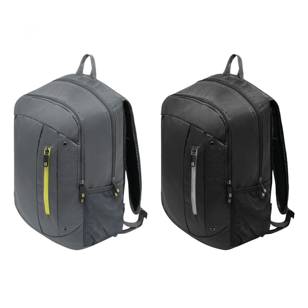Рюкзак TALLINN: 1 передний карман на молнии с органайзером, небольшой вертикальный передний карман с цветной молнией, 1 основное отделение на молнии с мягким внутренним отделением для ноутбука или планшета плюс дополнительный прорезной карман, 2 боковых сетчатых кармана, ручка для переноски, мягкие плечевые ремни и поддержка спины