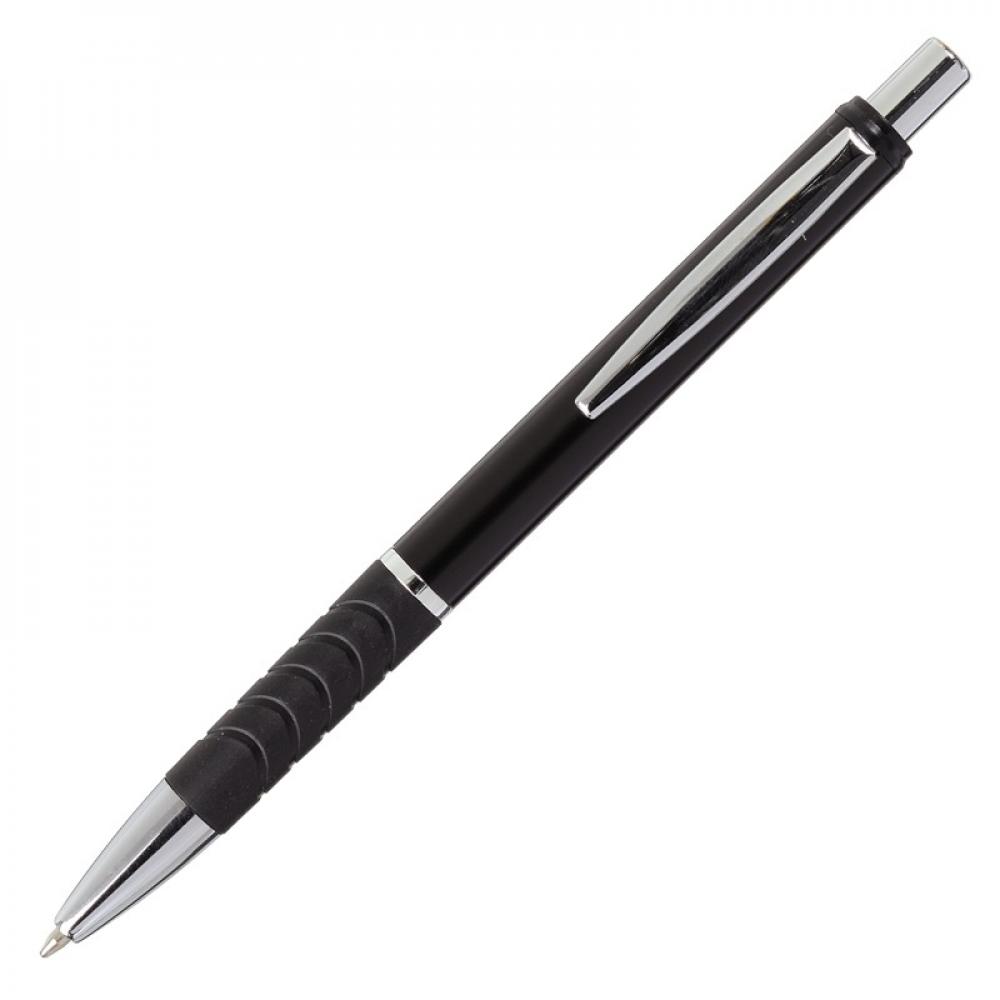 Рекламная блестящая алюминиевая шариковая ручка с резиной, металлическим зажимом и наконечником. Поставляется с синим стержнем. Возможна полноцветная печать (УФ).