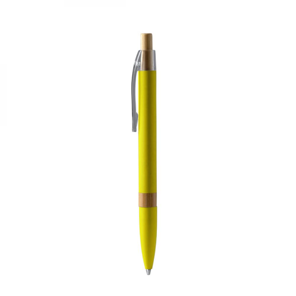 Ручка с корпусом из переработанного алюминия. Нажимная кнопка и детали из бамбука. Синий стержень.