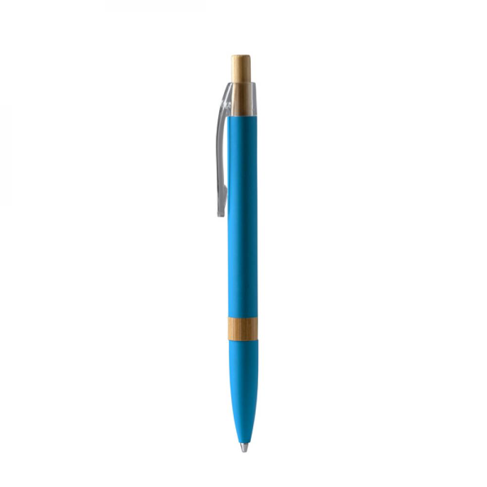 Ручка с корпусом из переработанного алюминия. Нажимная кнопка и детали из бамбука. Синий стержень.