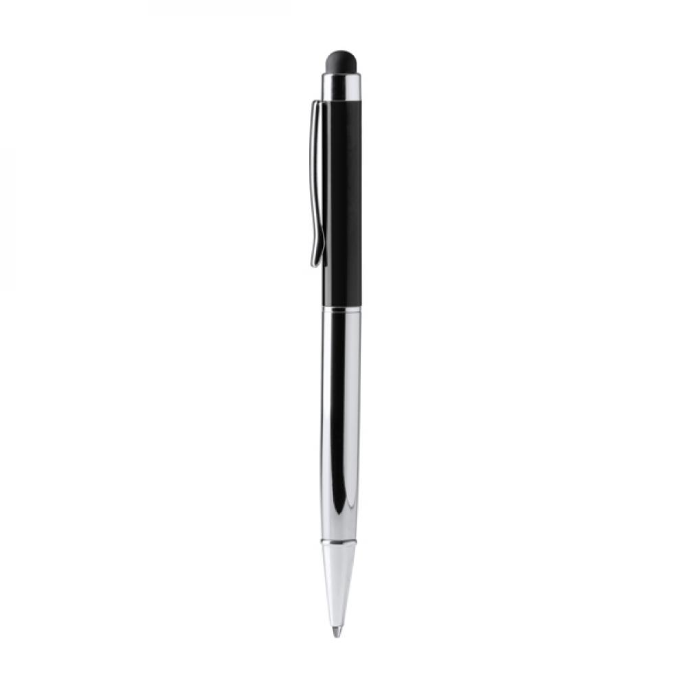 Шариковая ручка с корпусом из переработанного алюминия и сенсорным указателем. Наконечник и клип из хромированного металла. Сменный стержень для чернил в металлическом синем цвете. Представлена в коробке дизайна "крафт".