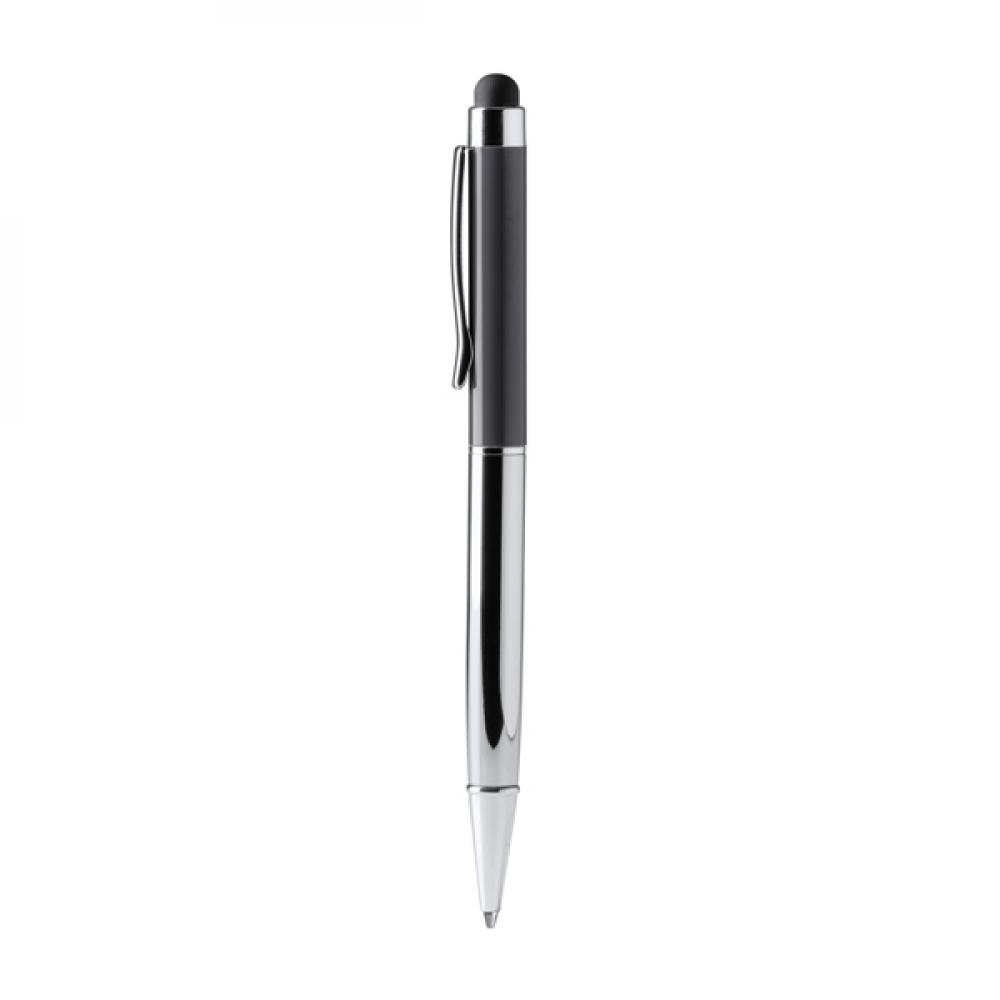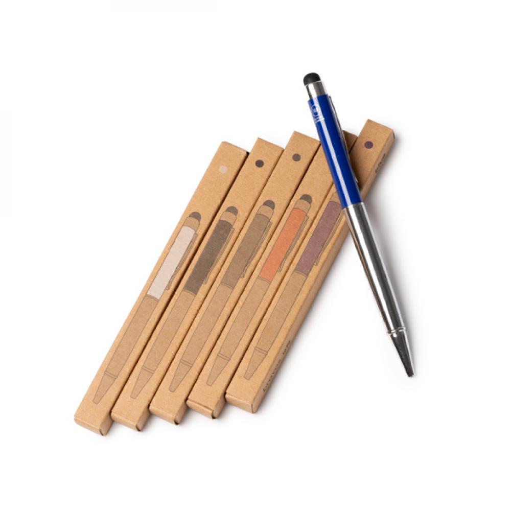 Шариковая ручка с корпусом из переработанного алюминия и сенсорным указателем. Наконечник и клип из хромированного металла. Сменный стержень для чернил в металлическом синем цвете. Представлена в коробке дизайна "крафт".