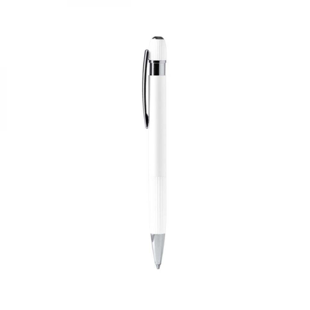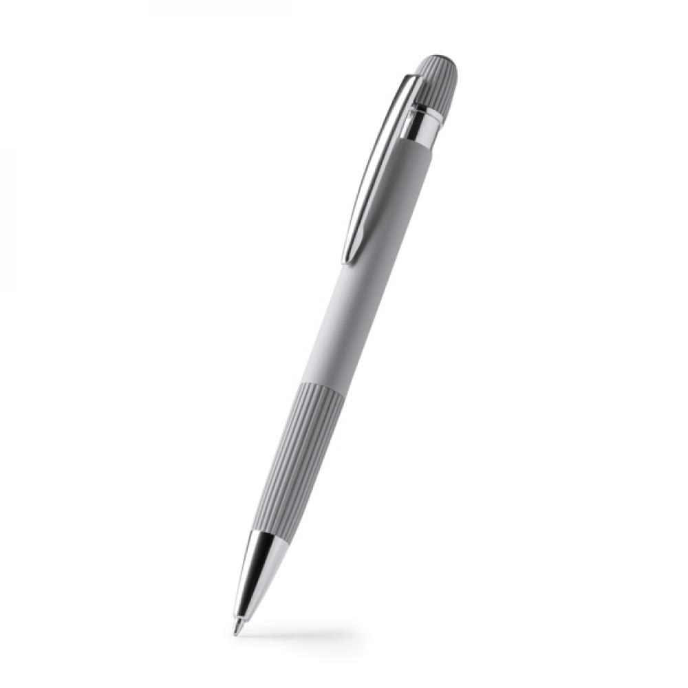 Ручка с корпусом из переработанного алюминия с полосатым упором и матовым резиновым покрытием. Детали в хромовой отделке. Крупный чернильный стержень с синим цветом.